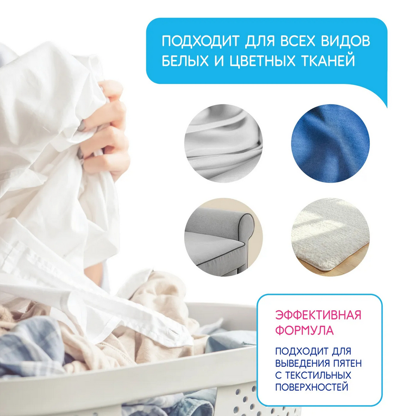 Мощный кислородный отбеливатель – пятновыводитель удаляет даже самую сильную и застарелую грязь с любой одежды и изделий из ткани (скатертей, штор, покрывал, синтетических ковров и т.д.), может применяться как для выведения отдельных пятен, так и при стирке.