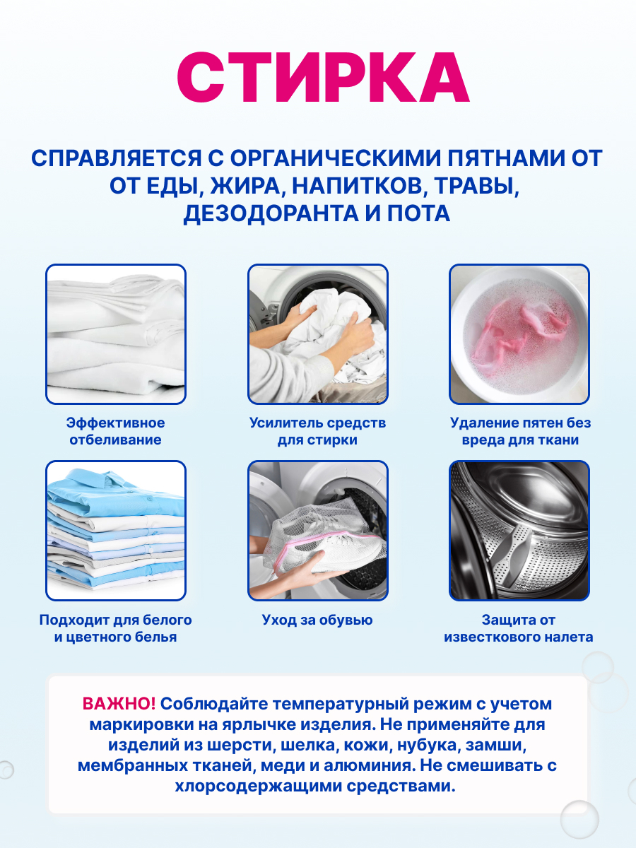 | Дополнительные свойства | Без хлора, с отбеливателем, с пятновыводителем, усиливает действие стирального порошка |