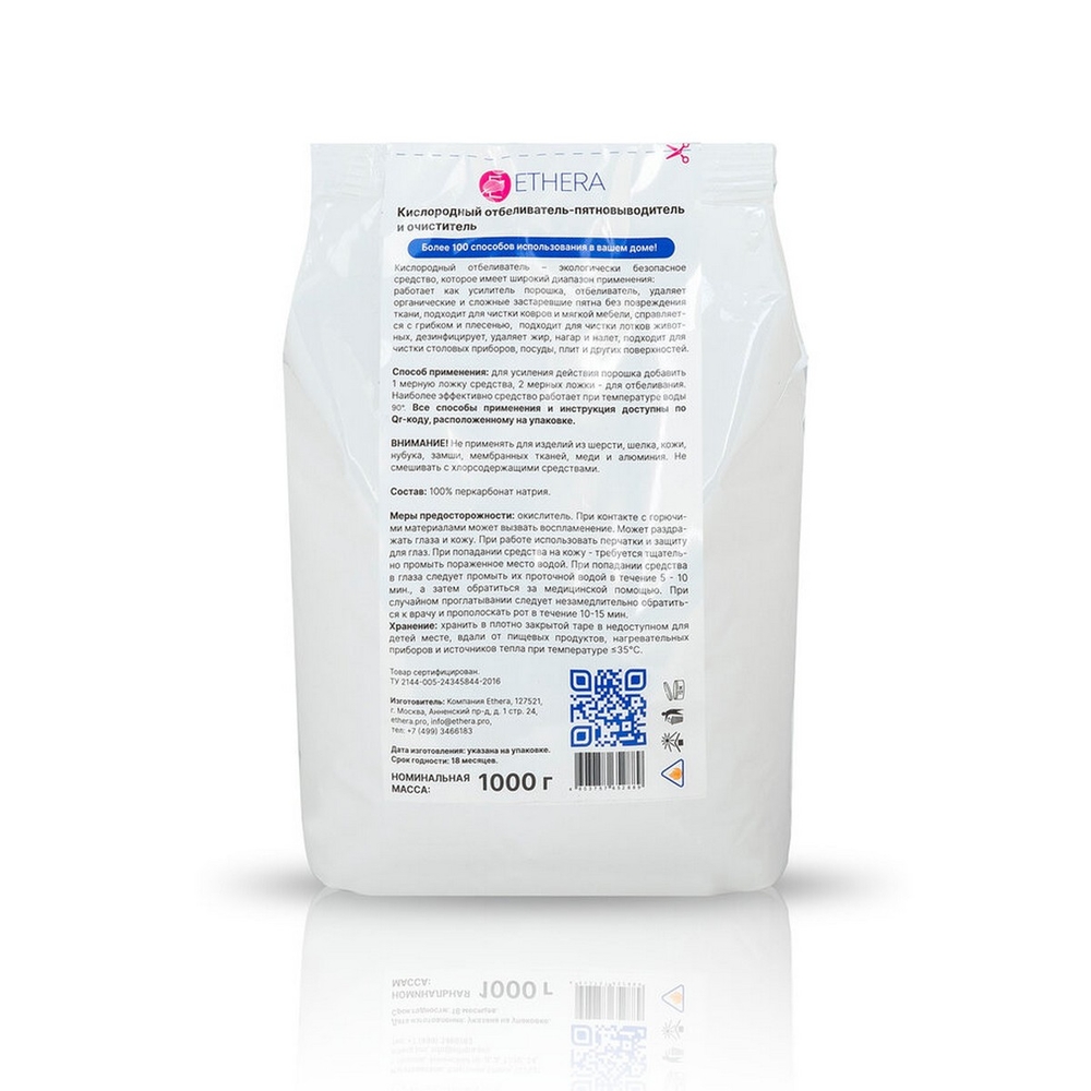 Кислородный очиститель Этэра эффективно удаляет загрязнения органического происхождения, будь то пятна от травы, земли, напитков, еды, жира. Безопасен для белых и цветных тканей. Средство многофункционально и вы можете использовать его для уборки всего дома: подходит для очищения посуды, кухонной утвари и столовых приборов, отлично справляется с известковым и мыльным налетом на кухне, в ванной, душевой и туалете, эффективно удаляет пятна с обивки мебели, ковров, обуви и т.д. Кроме того, кислородный очиститель дезинфицирует поверхности и удаляет неприятные запахи.