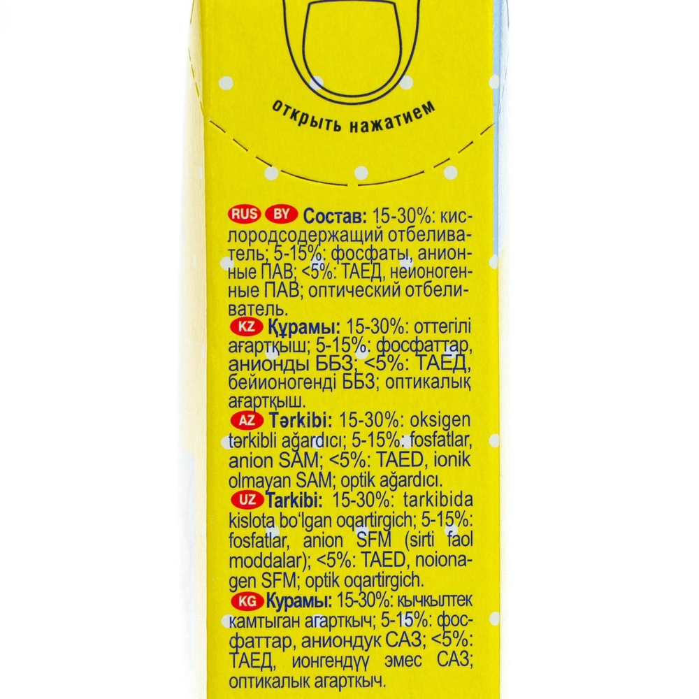 Отбеливает без кипячения при низких температурах, что позволяет сохранить первоначальный вид одежды даже после многократных стирок. Может использоваться для различных видов тканей как при стирке вручную, так и в стиральной машине. Позволяет экономить до 50% стирального порошка. Не содержит хлор.