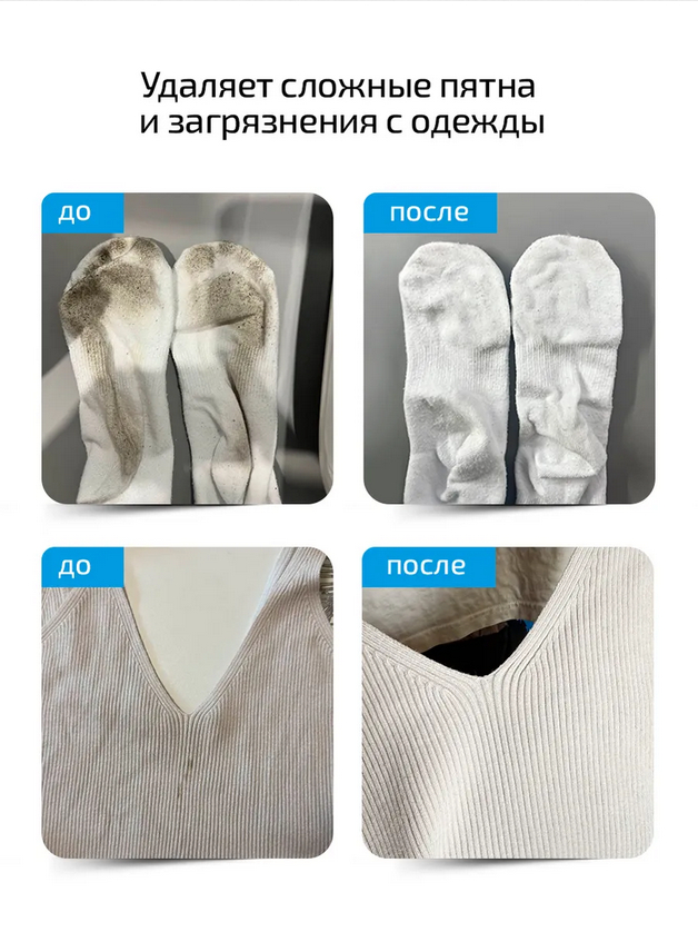 Футболки, простыни, полотенца, обувь, шапки, спортивная одежда, детские вещи – универсальный пятновыводитель эффективно борется с загрязнениями, при этом бережет ткани.