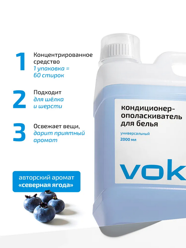 VOKA – безопасный выбор для всей семьи: в составе нет хлора, фосфатов, фосфонатов, оптических отбеливателей, нефтепродуктов, парабенов, агрессивных ПАВ и синтетических компонентов. Кондиционер бережно ухаживает за тканью, не оставляет разводов, не образует плёнку и не нарушает её структуру.
