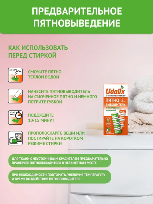 Кислородный очиститель работает на основе мощной кислородной формулы, которая обеспечивает отбеливание и чистку даже самых стойких загрязнений. Пятновыводитель бережно и безопасно воздействует на любые ткани, не деформируя их.