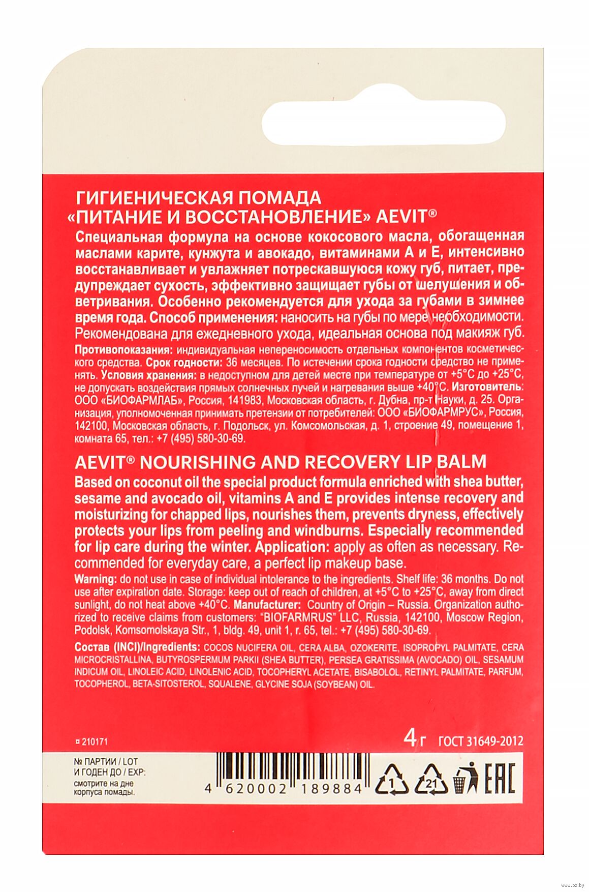 Гигиеническая помада АЕВИТ "Питание и восстановление" обеспечивает интенсивный уход в течение длительного времени. Эффективно защищает губы от обветривания в любое время года. Помогает при шелушении и обветривании кожи губ благодаря комплексу активных компонентов.