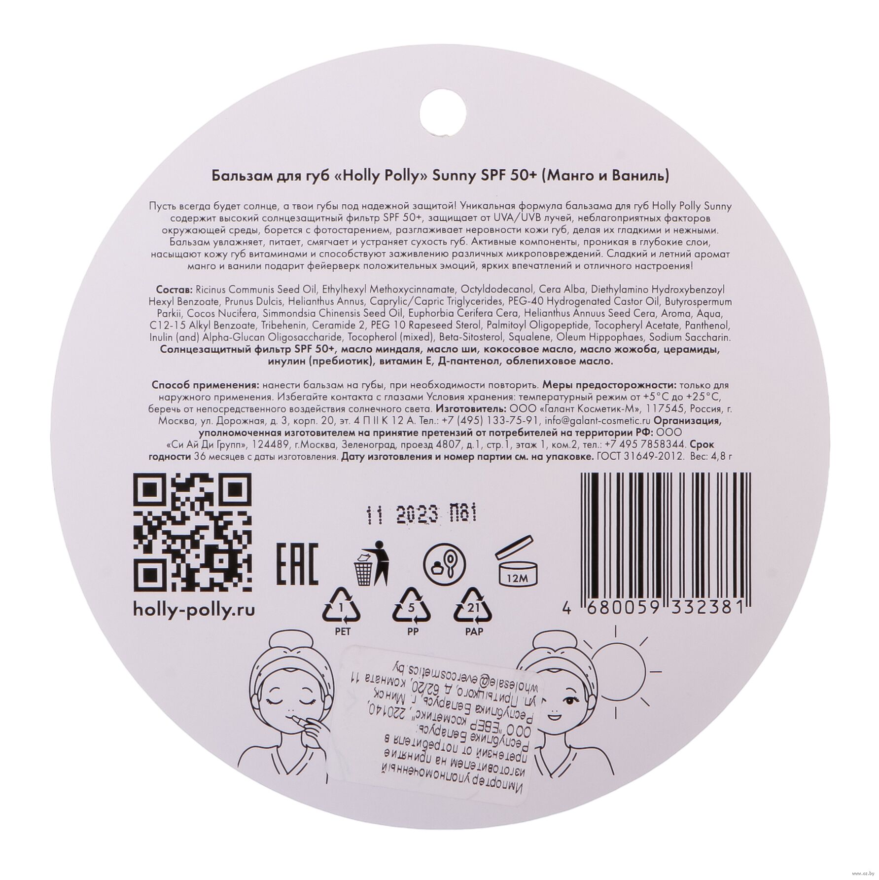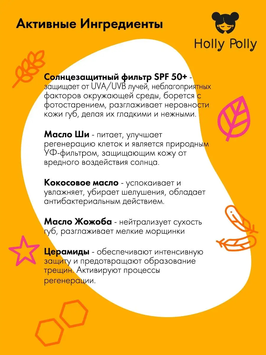 Пусть всегда будет солнце, а твои губы под надёжной защитой. Уникальная формула бальзама для губ Holly Polly Sunny содержит высокий солнцезащитный фильтр SPF 50+, защищает от UVA/UVB лучей, неблагоприятных факторов окружающей среды, борется с фотостарением, разглаживает неровности кожи губ, делая их гладкими и нежными.