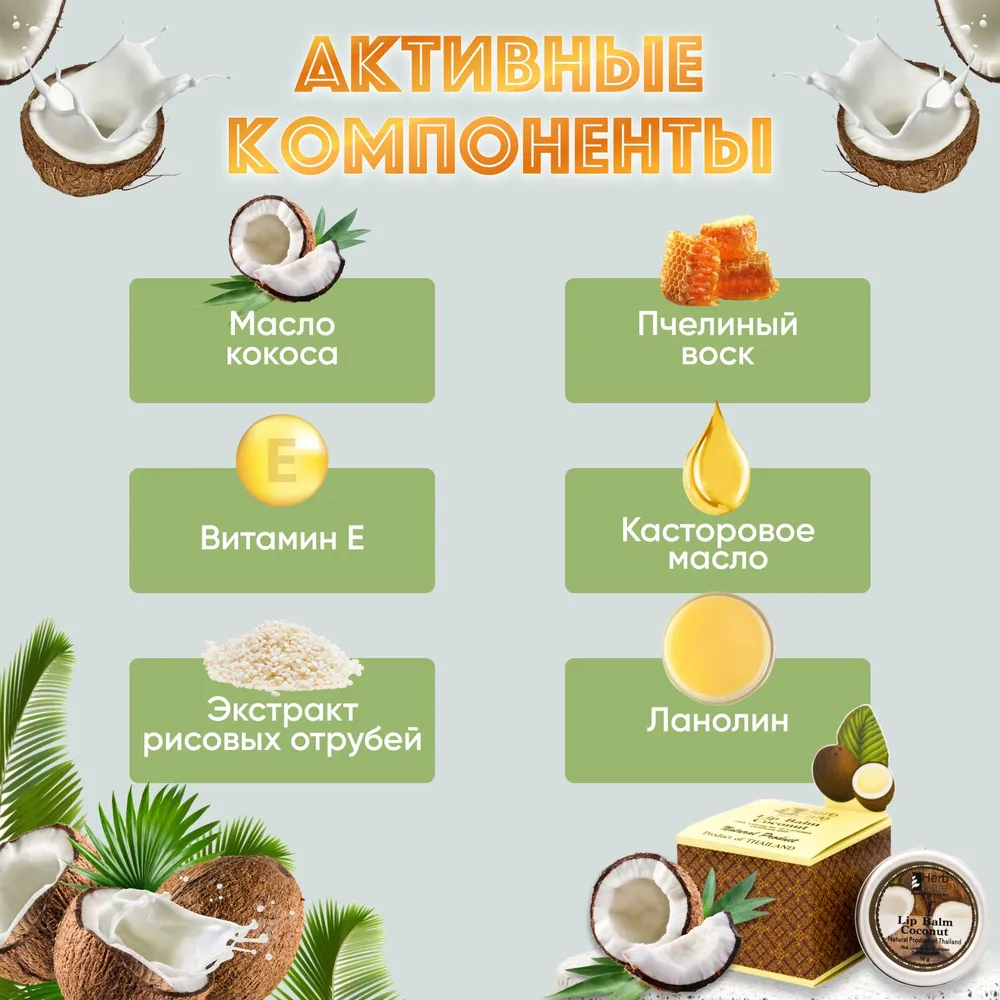 Бальзам для губ, обогащенный кокосовым маслом, маслом рисовых отрубей, касторовым маслом и витамином Е, отлично питает, интенсивно увлажняет и защищает кожу губ от сухости, шелушения, мелких трещинок, делая её гладкой, нежной и мягкой.