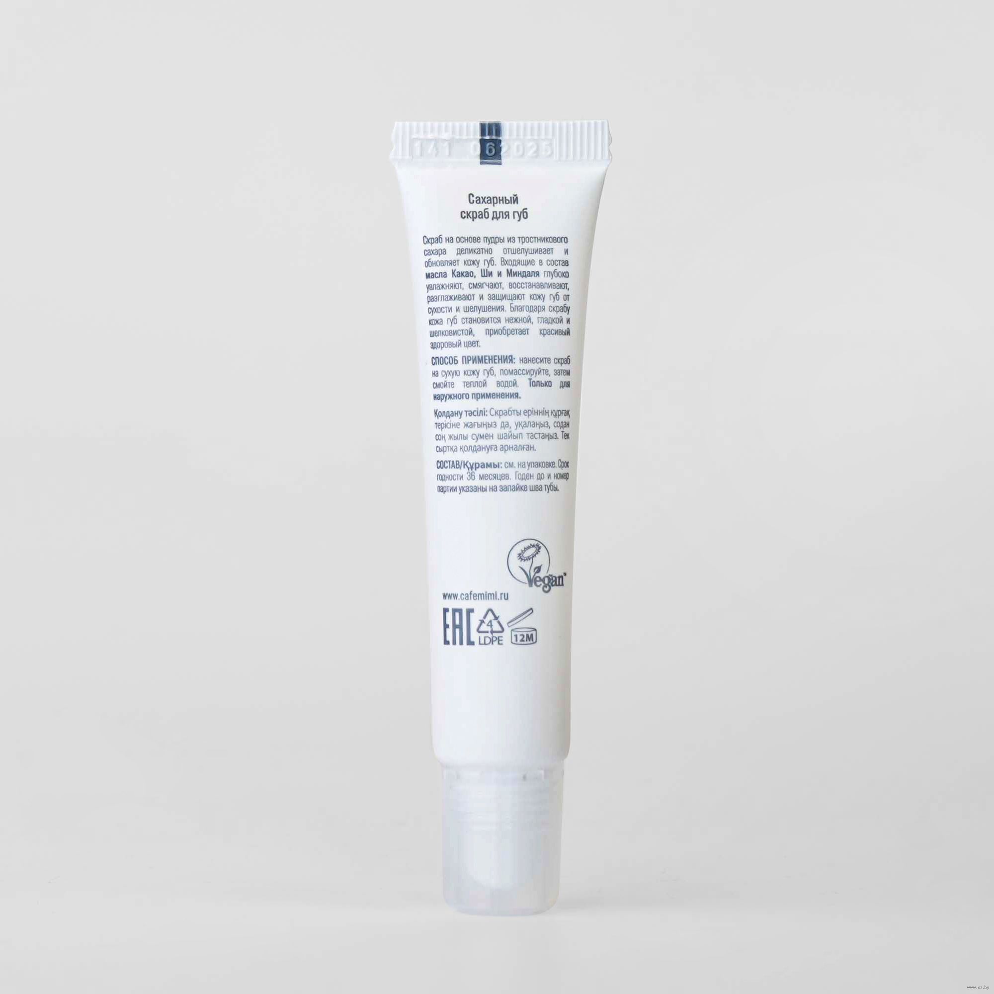 Нанесите скраб на сухую кожу губ, помассируйте, затем смойте теплой водой.Состав