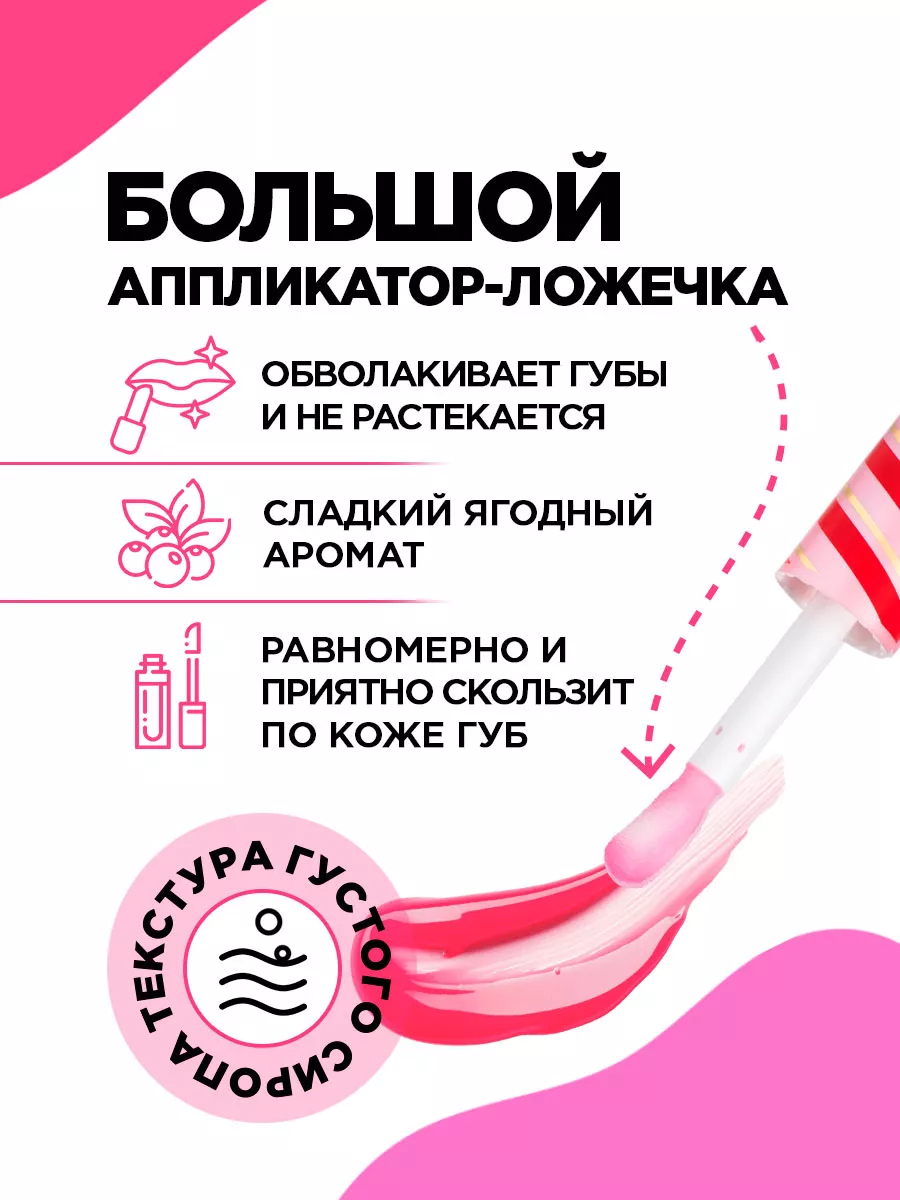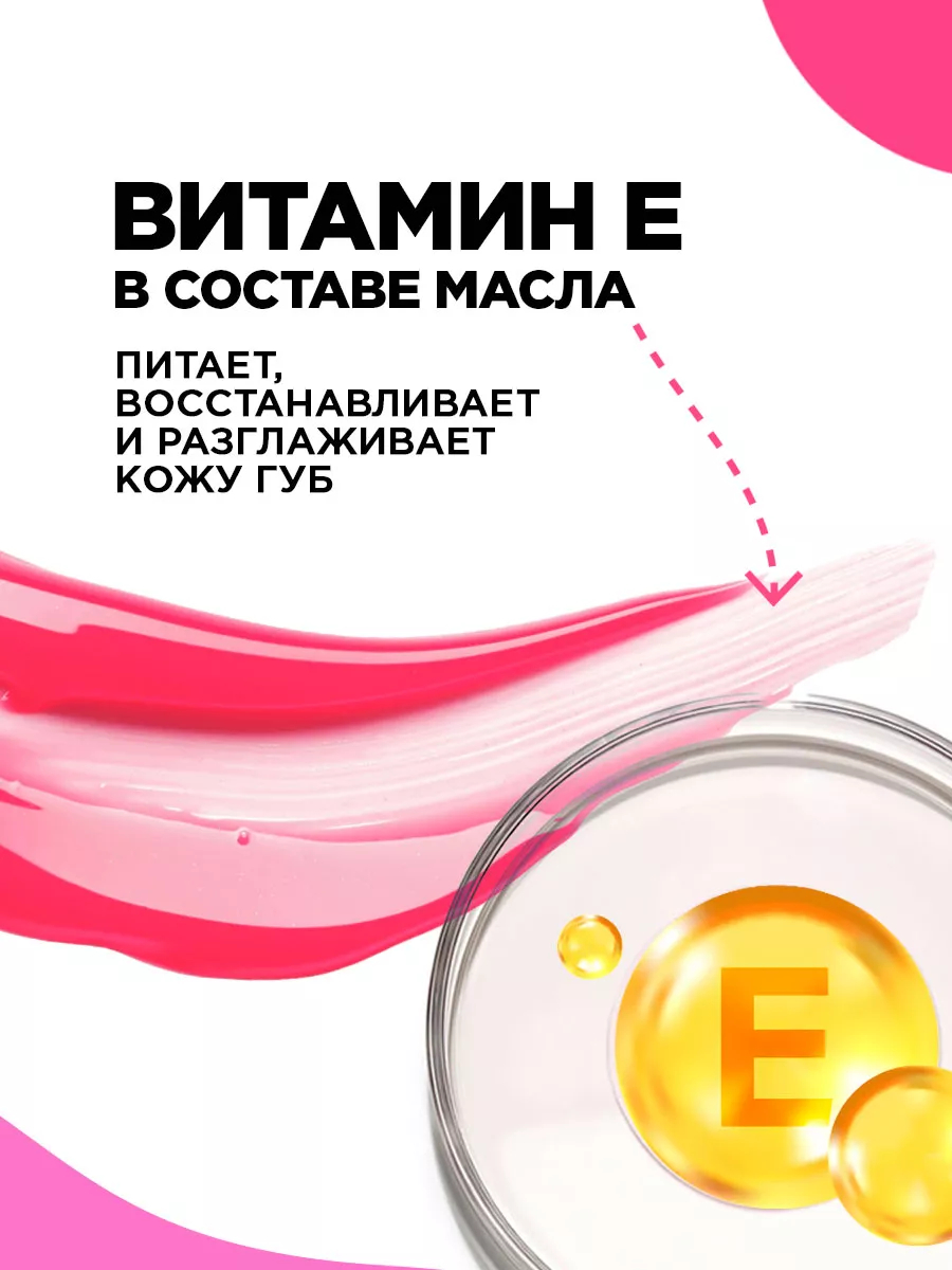 Текстура густого сиропа с волшебными пузырьками обволакивает Ваши губы, придает им легкий объём и влажный эффект, не липнет и не растекается, оставаясь абсолютно невесомой в течение всего дня. Большой пушистый аппликатор-ложечка обеспечивает равномерное распределение масла и очень приятно скользит по губам, а сладкий ягодный аромат не оставит вас равнодушными. Витамин Е в составе масла питает, восстанавливает и разглаживает кожу губ.