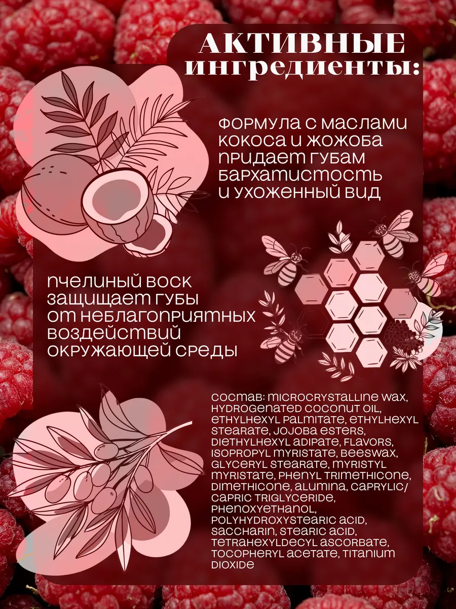 Увлажняющий бальзам для губ с ароматом малинового лимонада обогащен антиоксидантными витаминами C и E и насыщенными увлажняющими компонентами для устранения сухости губ. Этот нежный бальзам оставляет губы увлажненными и абсолютно сочными.