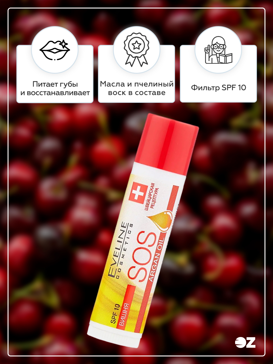Питательно-восстанавливающий бальзам для губ SOS Argan Oil с ароматом вишни разработан для ежедневного ухода за очень сухой кожей губ. Формула бальзама, включаяющая масло аргана, масло какао, витамины Е и С, интенсивно регенерирует, питает и увлажняет кожу губ, быстро избавляет от трещин и обветирвания.