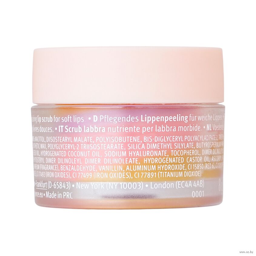Этот эффектный трёхцветный бальзам с нежными оттенками жёлтого, кораллового и розового мгновенно превращается в прозрачный, мягкий отшелушивающий скраб.