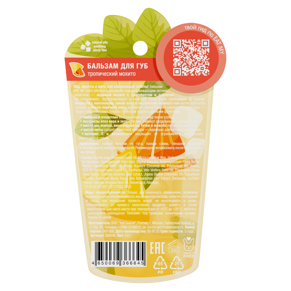 Лёд, фрукты и мята для освежающей заботы. Бальзам EAT MY balm aftersun вдохновлён самым освежающим летним напитком – ледяным мохито с грейпфрутом и ананасом. Он успокаивает, восстанавливает и смягчает кожу после пребывания на солнце.