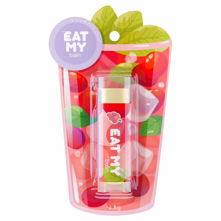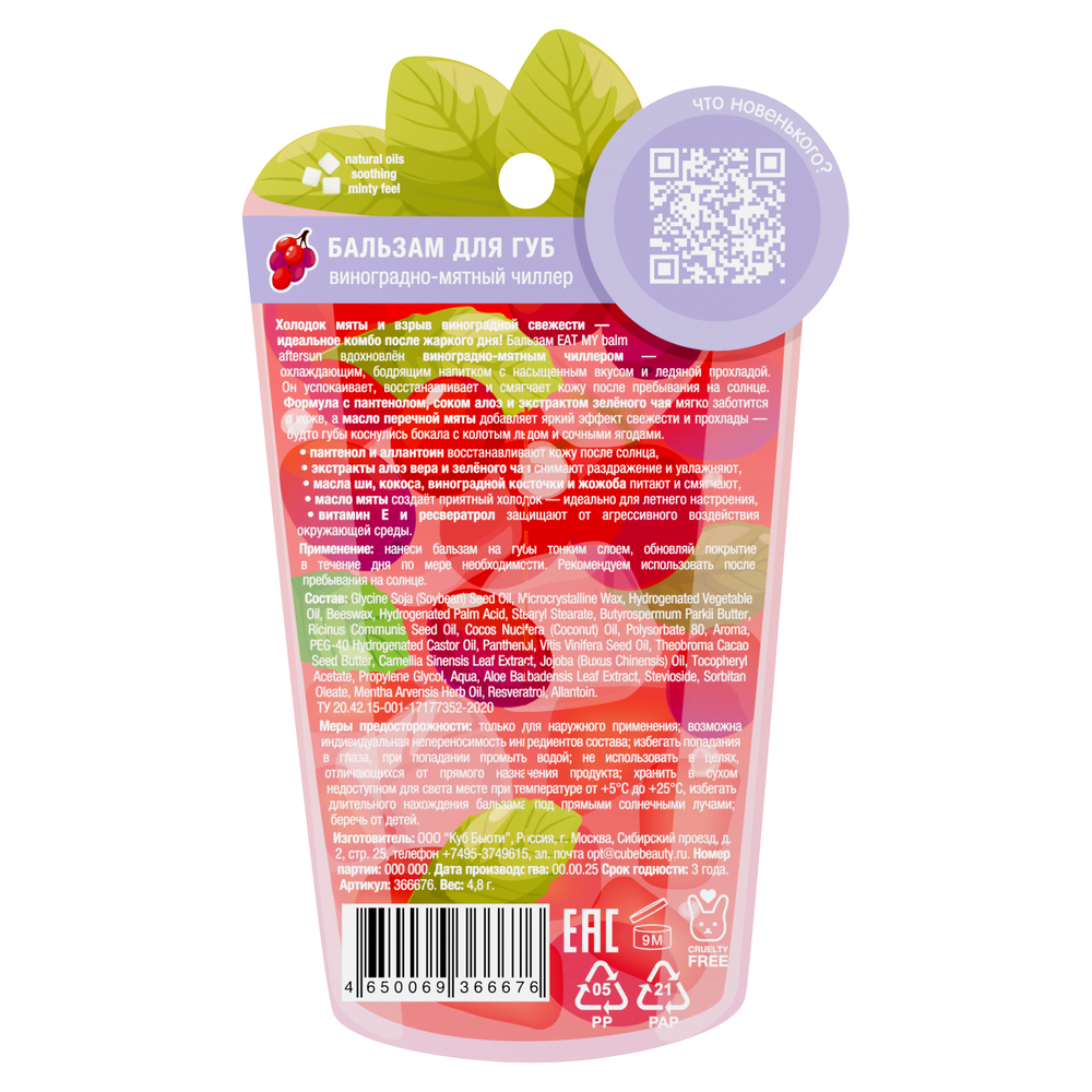 Холодок мяты и взрыв виноградной свежести – идеальное комбо после жаркого дня! Бальзам EAT MY balm aftersun вдохновлён виноградно-мятным чиллером охлаждающим, бодрящим напитком с насыщенным вкусом и ледяной прохладой.