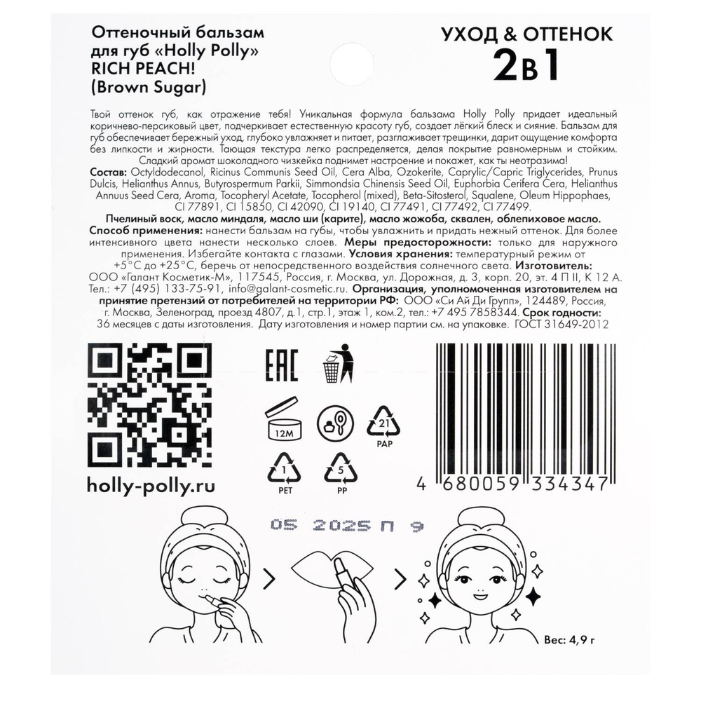 Твой оттенок губ, как отражение тебя! Уникальная формула бальзама Holly Polly придает идеальный коричнево-персиковый цвет, подчеркивает естественную красоту губ, создает лёгкий блеск и сияние.