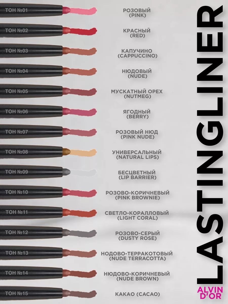 Водостойкий гелевый карандаш для губ "Lastingliner" – это идеальный выбор для создания стойкого и насыщенного цвета. Благодаря гелевой формуле, карандаш обеспечивает равномерное нанесение и насыщенный оттенок.