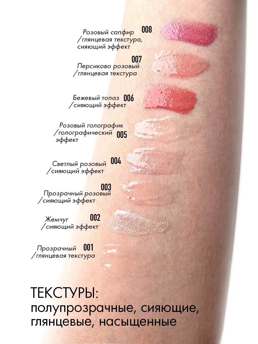 Насыщенный, нежный и питательный блеск для губ. Визуально делает губы более пухлыми. Можно использовать как соло – в роли блеска для губ, а также наносить поверх помады.