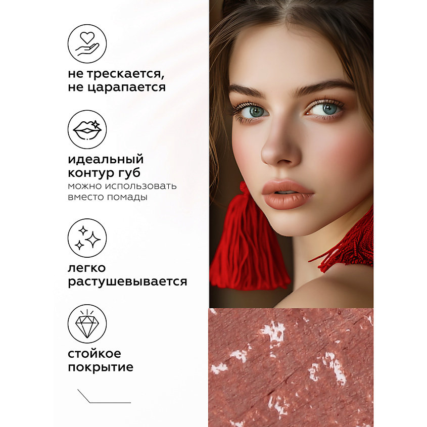 Создает безупречный контур и подчеркивает форму губ. Губной карандаш подходит как самостоятельное средство, для нанесения тонких линий, основа для блеска, помады или тинта. Лайнер для губ с кремовой текстурой хорошо растушевывается, можно использовать вместо губной помады. Механический карандаш имеет удобный пластиковый корпус, выдвижной механизм подходит для повседневного макияжа и вечернего образа. Встроенная точилка позволяет быстро заточить грифель для создания линий любой формы и толщины. Удобный формат, не требует затачивания и гигиеничен в использовании.