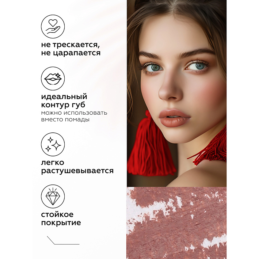 Создает безупречный контур и подчеркивает форму губ. Губной карандаш подходит как самостоятельное средство, для нанесения тонких линий, основа для блеска, помады или тинта. Лайнер для губ с кремовой текстурой хорошо растушевывается, можно использовать вместо губной помады. Механический карандаш имеет удобный пластиковый корпус, выдвижной механизм подходит для повседневного макияжа и вечернего образа. Встроенная точилка позволяет быстро заточить грифель для создания линий любой формы и толщины. Удобный формат, не требует затачивания и гигиеничен в использовании.