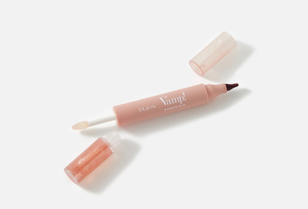 С одной стороны маркер для губ для легкого нанесения цвета, с другой – масляный блеск для блестящего эффекта.