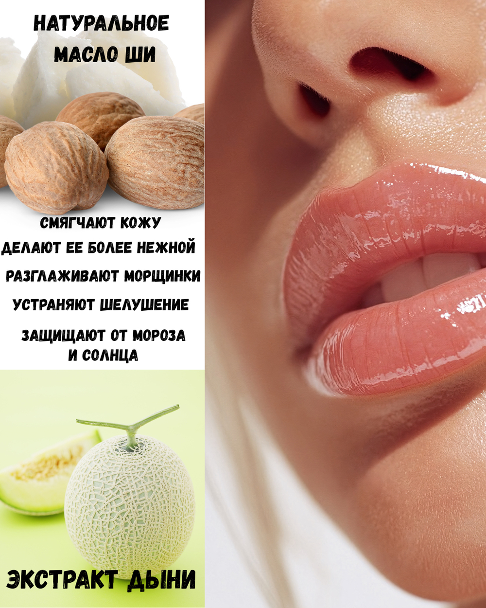 Входящие в состав натуральное масло Ши, экстракт дыни и витамин Е увлажняют и смягчают кожу, делают ее более нежной, устраняют шелушение, способствуют разглаживанию морщинок, защищают от мороза и солнца.