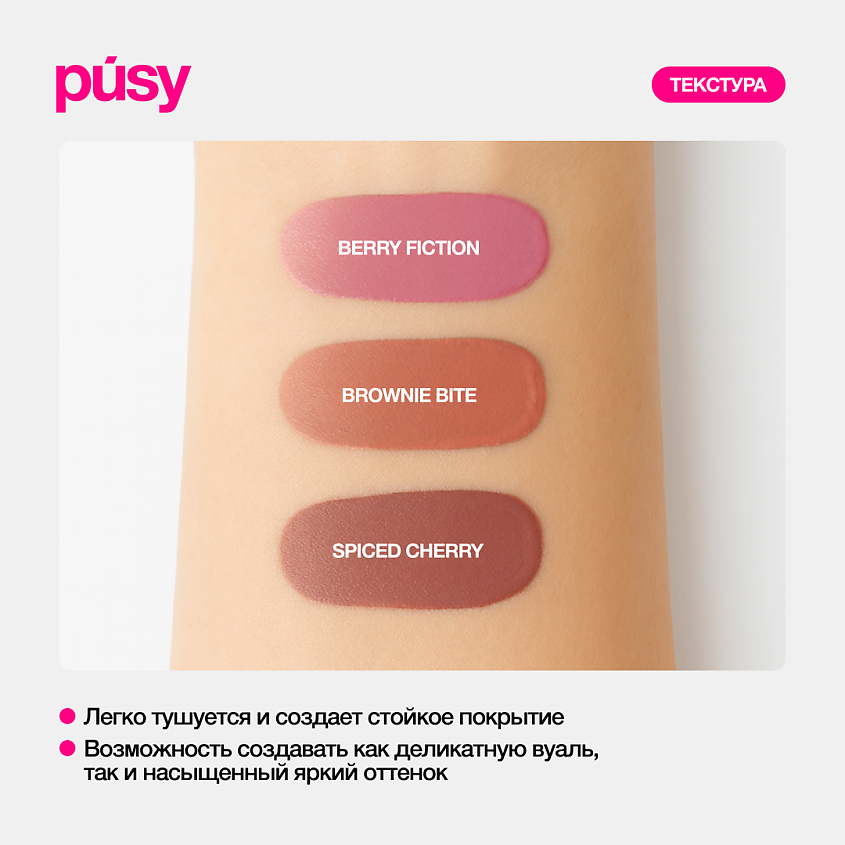 Легкая, воздушная текстура кремового тинта от Pusy мягко ложится на губы, легко растушевывается и создает стойкое покрытие без ощущения сухости.