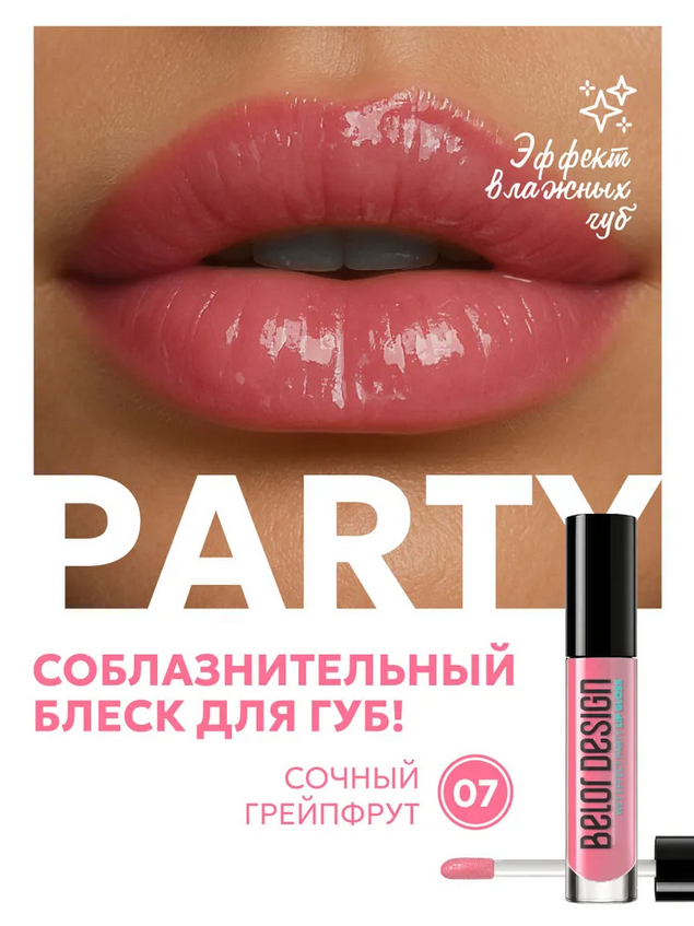 Полупрозрачный блеск "Party" с эффектом "влажных губ" делает губы более объемными, не скатывается и не сушит губы, без ощущения липкости.