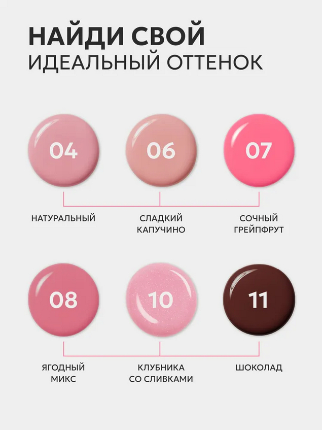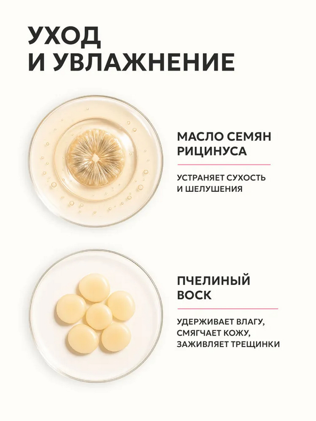 Мягкая и комфортная текстура скрывает шелушения и делает губы ухоженными и увлажненными. Невесомая кремовая консистенция не растекается и не забивается в складки.