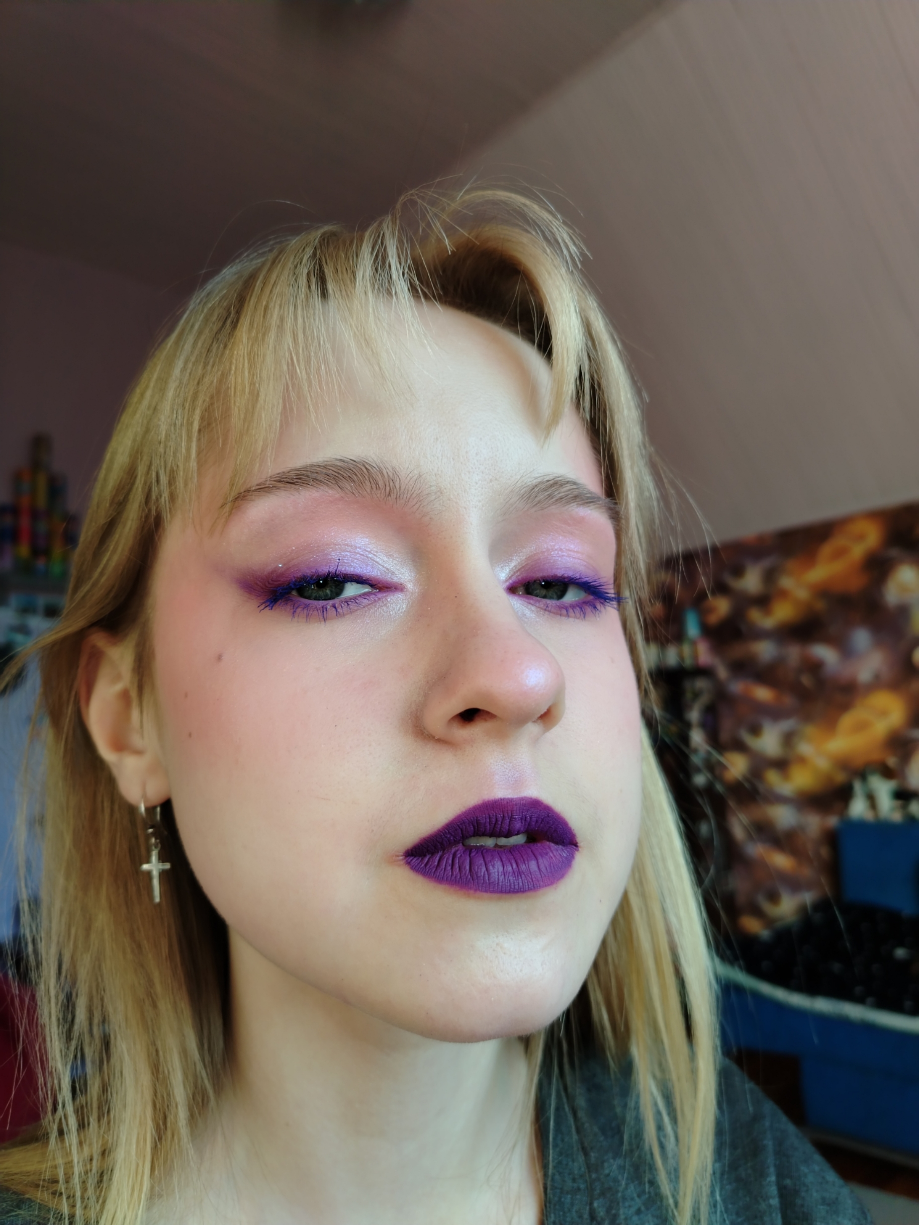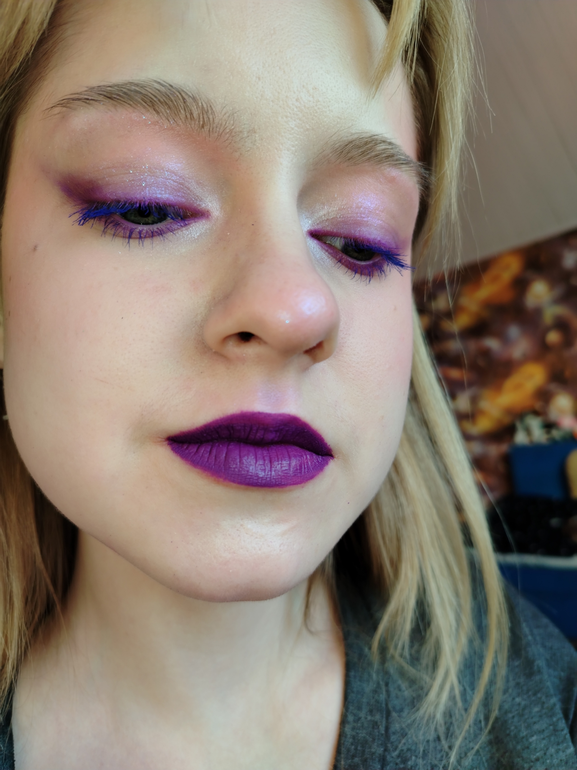 Так, давайте не обращать внимание на этот прекрасный контур, я первый раз купила матовую помаду:) Цвет шикарный, по аромату - что-то между химозным виноградом и китайским пластиком, но когда помада на губах, то этот запах почти не ощущается. Очень привередливая, так как нанесла на увлажнённые губы, а на кисточке всеравно какие-то шелушинки вылезли. Очень слойкая, стирается чуток ближе к центру, но по краям... Проще губы наждачкой сточить, чем смыть эту помаду, не затинтовав половину лица. По хорошему бы, нужно поискать карандашик в цвет, так как апликатором ровный край получится вывести только у избранных. Кароче, помада прикольная, но явно не на каждый день(а то у вас губ не останется после смывания), но для каких-то интересных образов и если смотреть чуть поодаль - топ, 3,5 из 5.