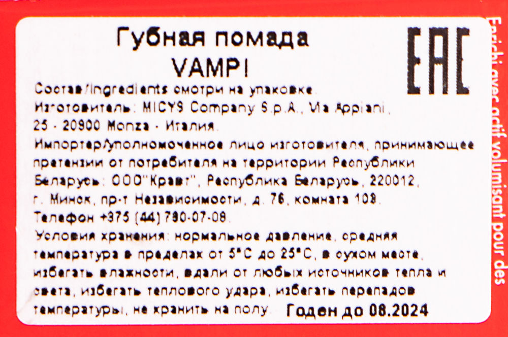 Обогащена специальным активным компонентом с эффектом плампера для пухлых, выразительных и четко выделенных губ.