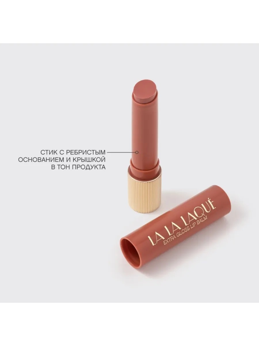 "La La Laque" упакована в стик с ребристым золотистым основанием и крышкой в тон помады-бальзама. Механизм футляра позволяет выкрутить небольшое количество продукта для использования, что так важно для тающей текстуры.