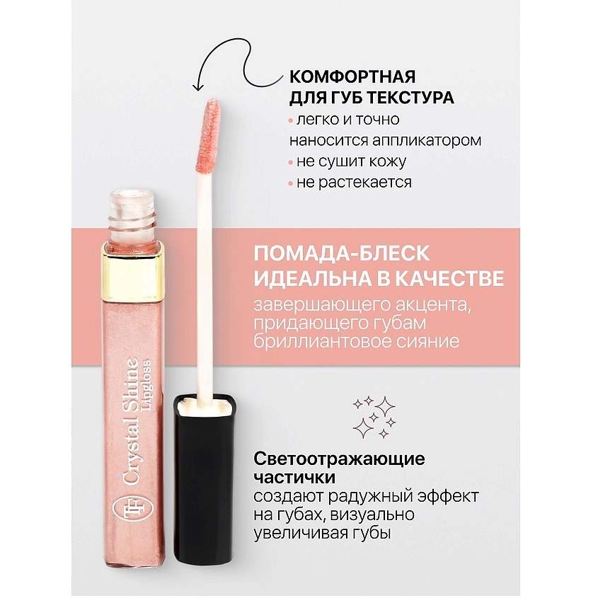 Помада-блеск идеальна в качестве завершающего акцента, придающего губам бриллиантовое сияние.Комфортная для губ текстура, легко и точно наносится аппликатором, не сушит кожу и не растекается.