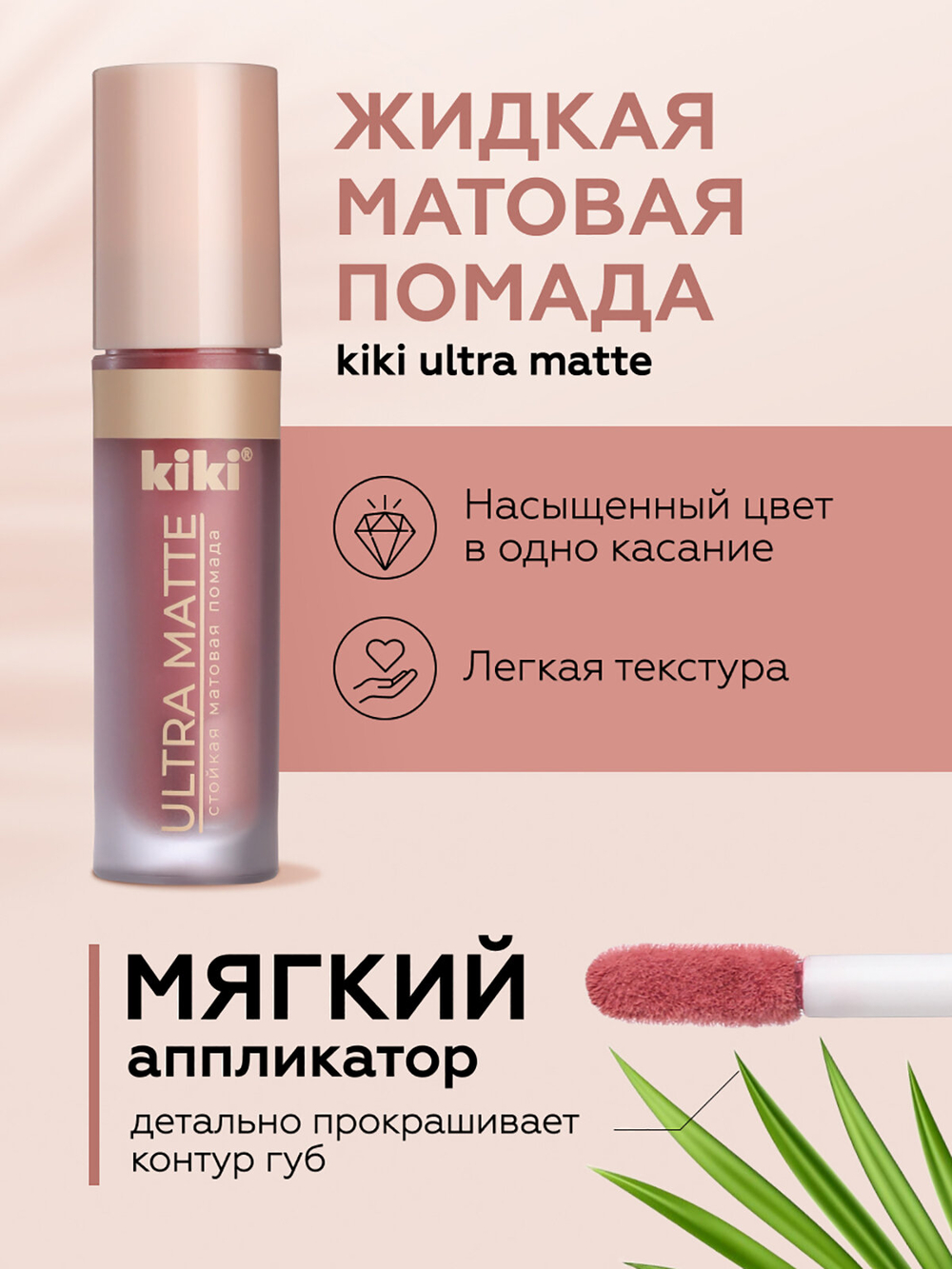 Новая жидкая матовая помада для губ KIKI "Ultra Matte" имеет ультраматовую формулу, которая благодаря своей легкой текстуре, сливается с кожей губ, создавая безупречно гладкое стойкое покрытие.