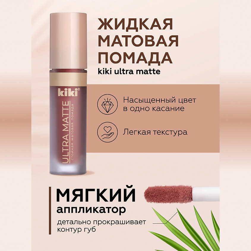 Новая жидкая матовая помада для губ KIKI "Ultra Matte" имеет ультраматовую формулу, которая благодаря своей легкой текстуре, сливается с кожей губ, создавая безупречно гладкое стойкое покрытие.