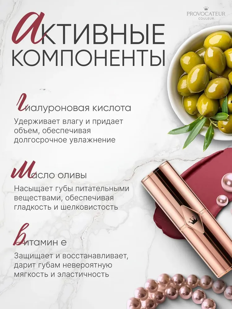 Стойкие пигменты обеспечивают красивый цвет, а легкий аромат роскоши и заботы позволяет носить помаду с удовольствием!