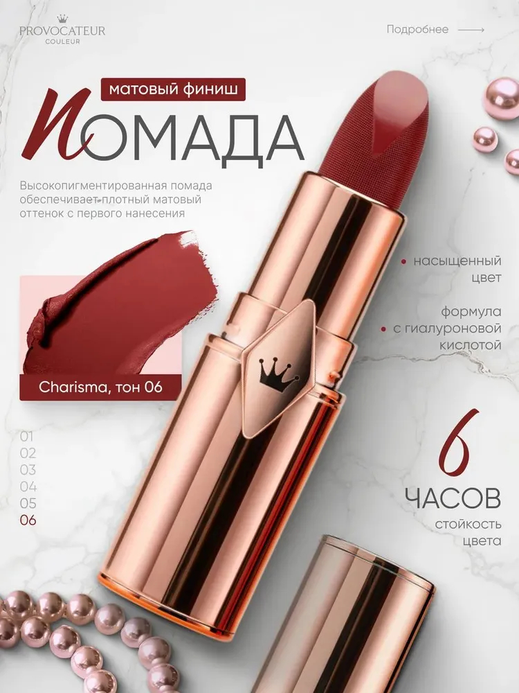 Высокопигментированная помада обеспечивает плотный матовый оттенок с первого нанесения и обладает стойкостью до 6 часов. Прекрасно держит контур, даже без карандаша!