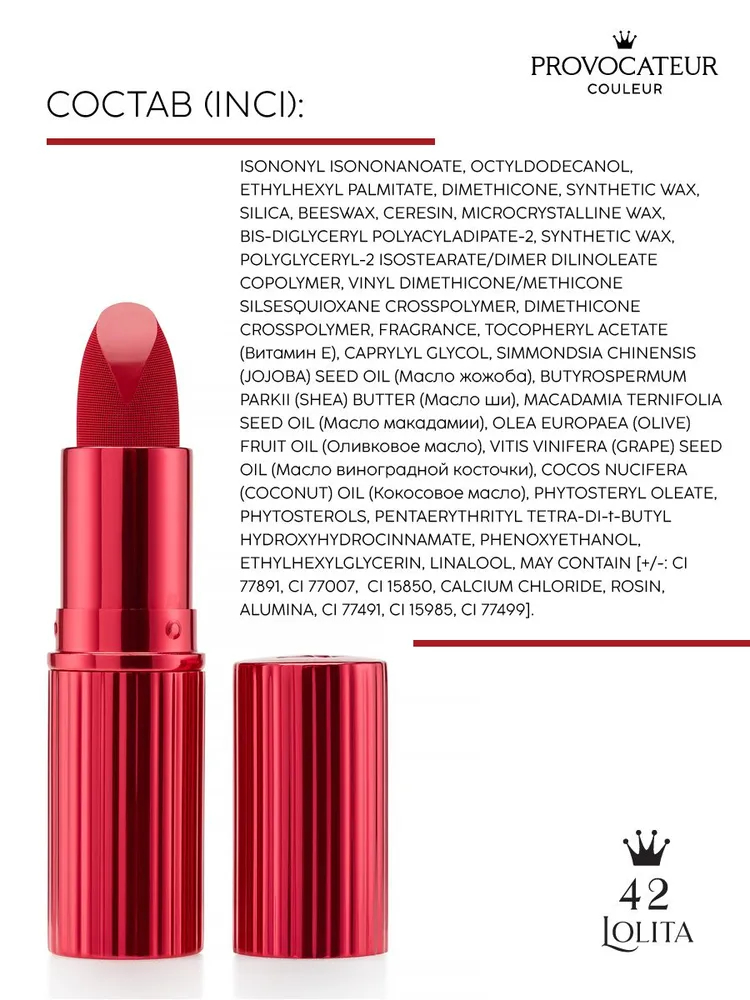 Isononyl isononanoate, octyldodecanol, ethylhexyl palmitate, dimethicone, synthetic wax, silica, beeswax, ceresin, microcrystalline wax, bis-diglyceryl polyacyladipate-2, synthetic wax, polyglyceryl-2 isostearate/dimer dilinoleate copolymer, vinyl dimethicone/methicone silsesquioxane crosspolymer, dimethicone crosspolymer, fragrance, tocopheryl acetate (витамин е), caprylyl glycol, simmondsia chinensis (jojoba) seed oil (масло жожоба), butyrospermum parkii (shea) butter (масло ши), macadamia ternifolia seed oil (масло макадамии), olea europaea (olive) fruit oil (оливковое масло), vitis vinifera (grape) seed oil (масло виноградной косточки), cocos nucifera (coconut) oil (кокосовое масло), phytosteryl oleate, phytosterols, pentaerythrityl tetra-di-t-butyl hydroxyhydrocinnamate, phenoxyethanol, ethylhexylglycerin, linalool, may contain [+/-: ci 77891, ci 77007, ci 15850, calcium chloride, rosin, alumina, ci 77491, ci 15985, ci 77499].