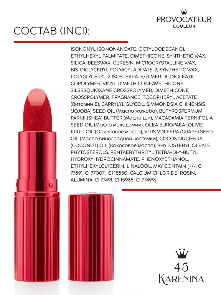Isononyl isononanoate, octyldodecanol, ethylhexyl palmitate, dimethicone, synthetic wax, silica, beeswax, ceresin, microcrystalline wax, bis-diglyceryl polyacyladipate-2, synthetic wax, polyglyceryl-2 isostearate/dimer dilinoleate copolymer, vinyl dimethicone/methicone silsesquioxane crosspolymer, dimethicone crosspolymer, fragrance, tocopheryl acetate (витамин е), caprylyl glycol, simmondsia chinensis (jojoba) seed oil (масло жожоба), butyrospermum parkii (shea) butter (масло ши), macadamia ternifolia seed oil (масло макадамии), olea europaea (olive) fruit oil (оливковое масло), vitis vinifera (grape) seed oil (масло виноградной косточки), cocos nucifera (coconut) oil (кокосовое масло), phytosteryl oleate, phytosterols, pentaerythrityl tetra-di-t-butyl hydroxyhydrocinnamate, phenoxyethanol, ethylhexylglycerin, linalool, may contain [+/-: ci 77891, ci 77007, ci 15850, calcium chloride, rosin, alumina, ci 77491, ci 15985, ci 77499].