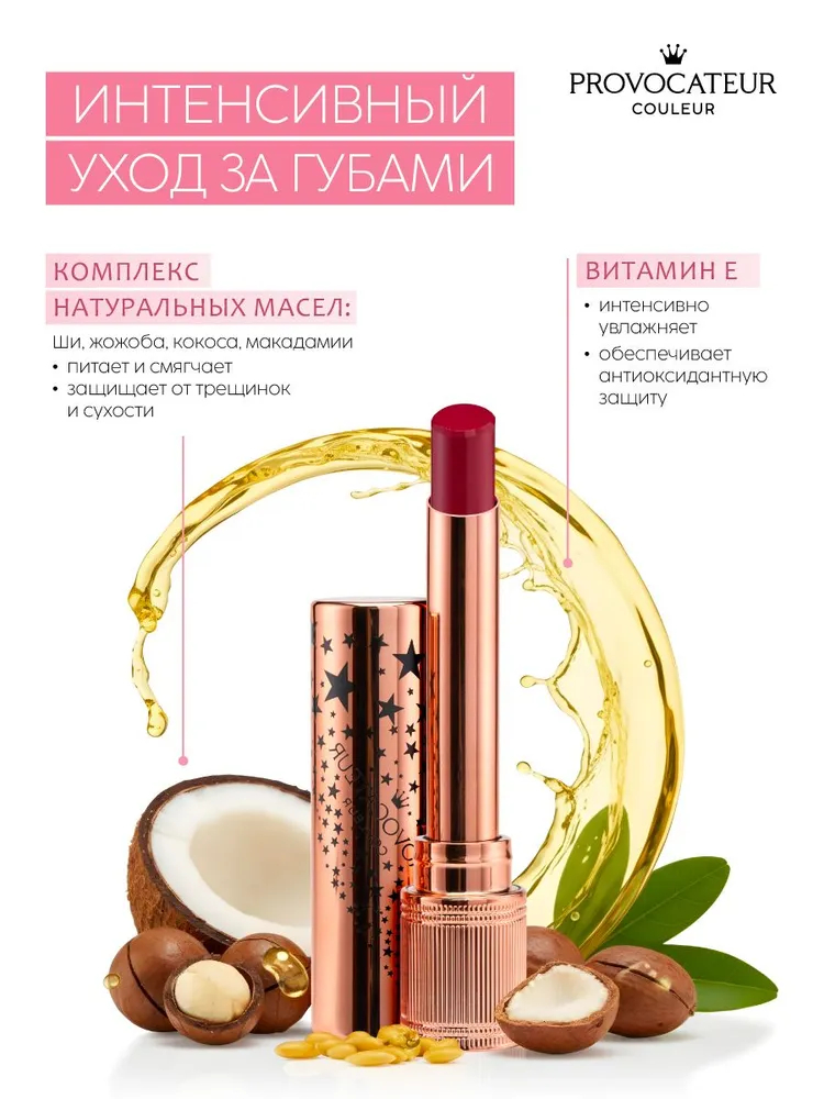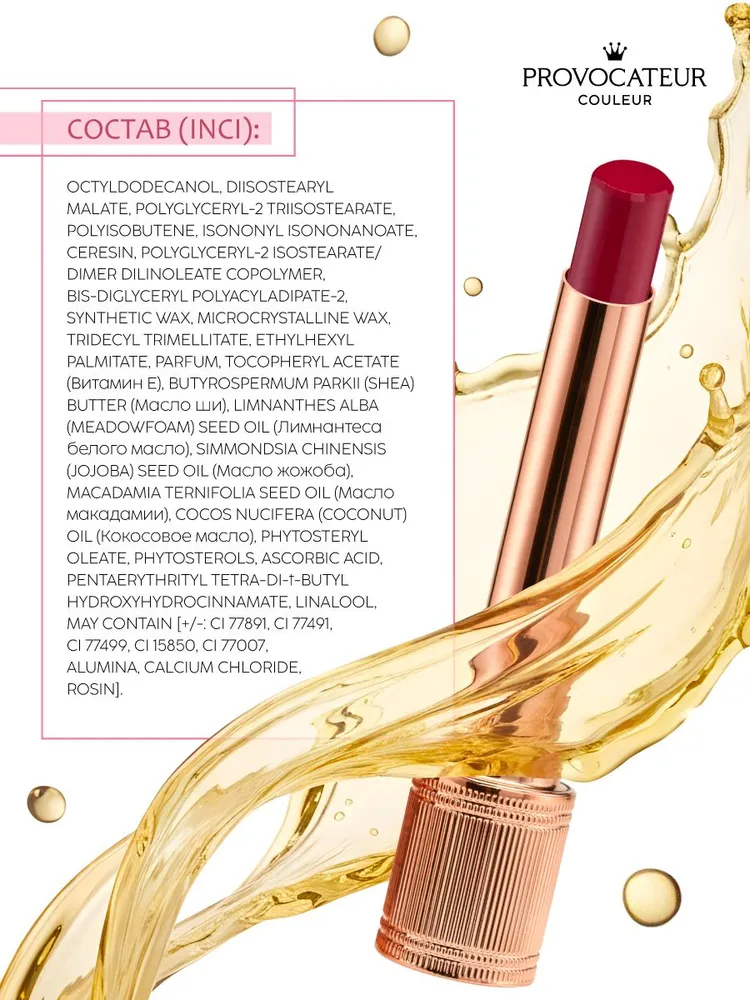 Благодаря насыщенности пигментами цвет проявляется при первом же касании и сохраняется на губах несколько часов – даже после того, как масла впитываются в кожу губ.