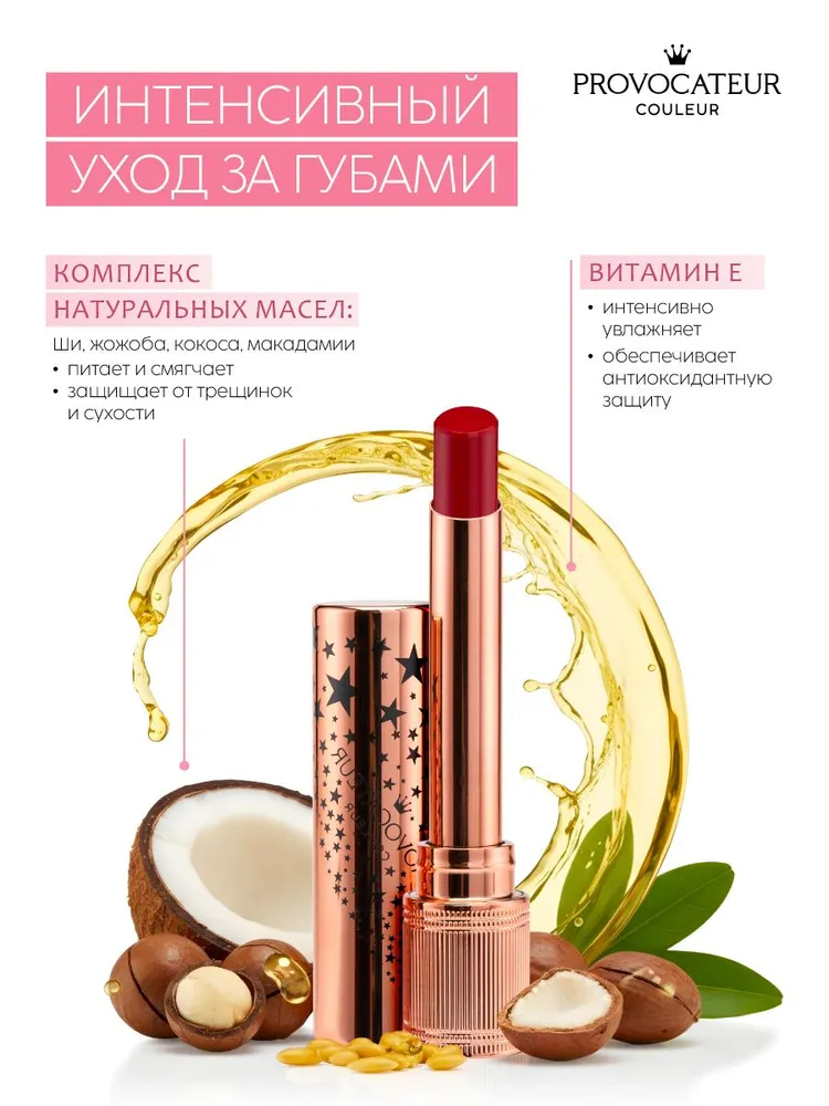 Благодаря насыщенности пигментами цвет проявляется при первом же касании и сохраняется на губах несколько часов – даже после того, как масла впитываются в кожу губ.