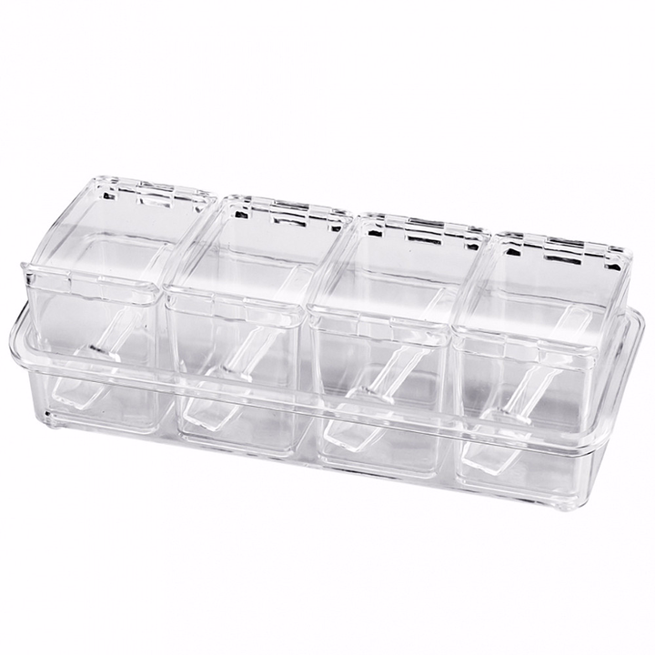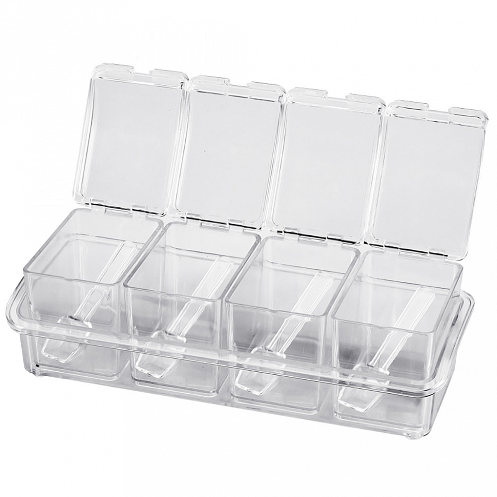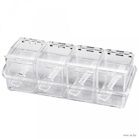 Комплект включает в себя 4 контейнера в лотке, предназначенные для хранения и организации разнообразных специй. Баночки имеют прозрачные крышки и ложечки внутри.