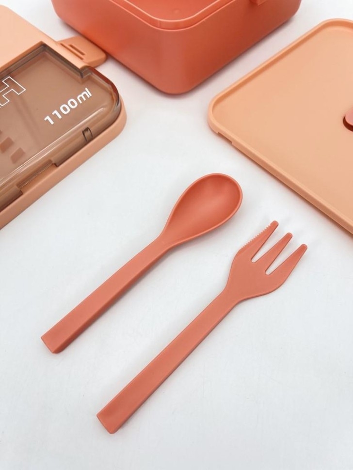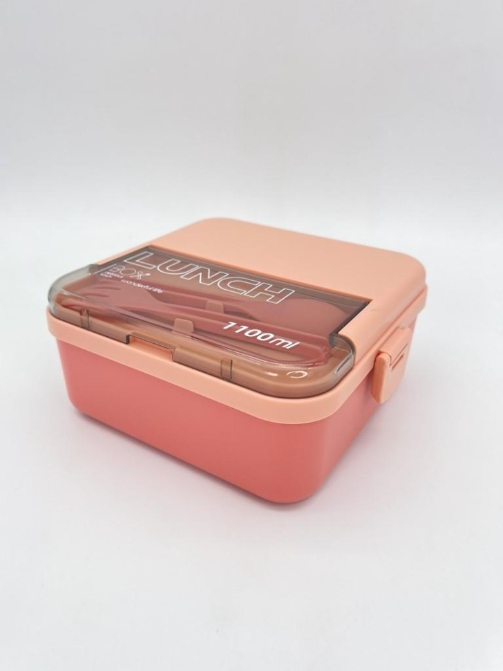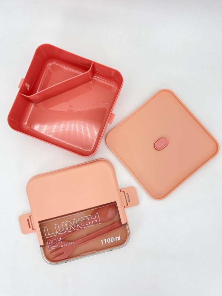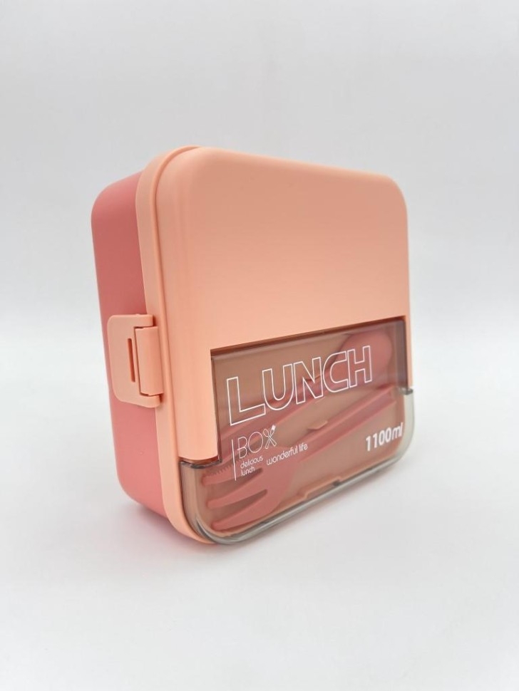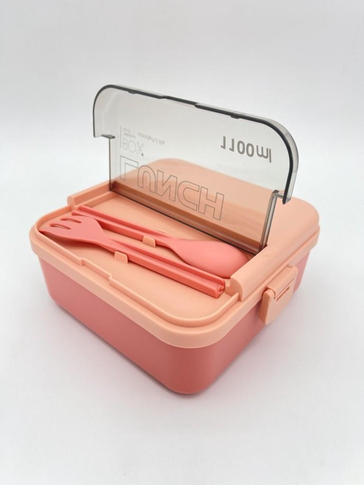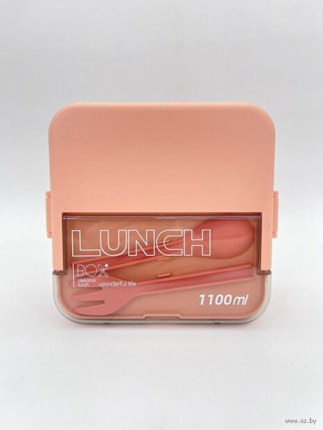 Ланч-бокс выполнен из высококачественного пищевого пластика. Состоит из одного отделения, разделенного на 2 отсека, имеется отдельный отсек для столовых приборов (в комплекте ложка и вилка).