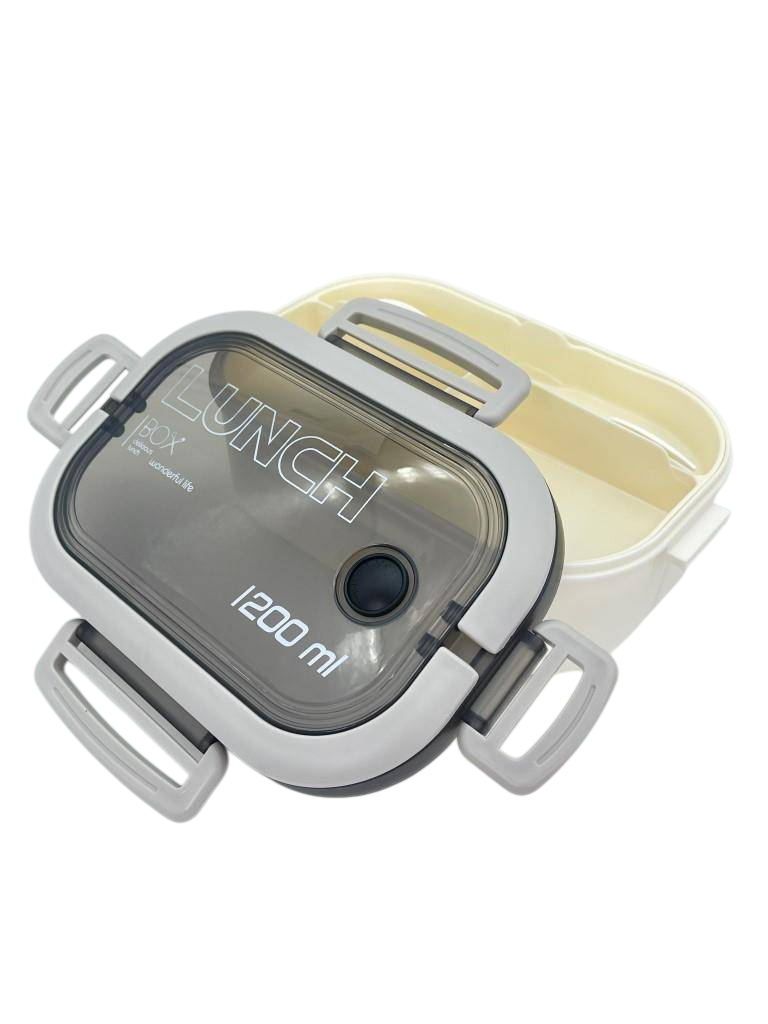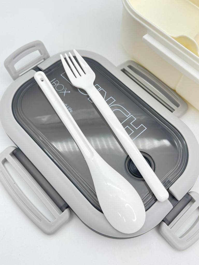 Ланч-бокс состоит из 2 ярусов: 1 ярус – одно отделение с тремя отсеками, 2 ярус – два отделения и отсек для столовых приборов (в комплекте ложка и вилка). Герметичная крышка оснащена клапаном для выпуска пара и удобной ручкой для переноски.