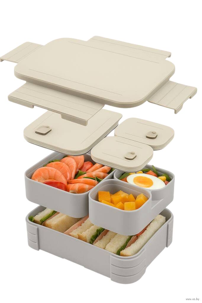Ланч-бокс состоит из двух ярусов и изготовлен из прочного пищевого пластика. Каждый ярус имеет отдельную крышку с фиксирующими защёлками, обеспечивающими герметичность.