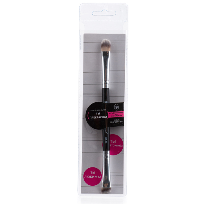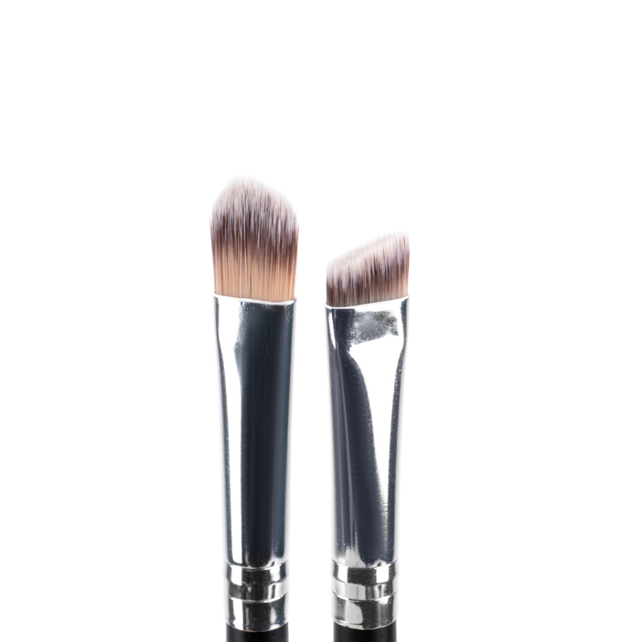 Двусторонний инструмент для нанесения и растушевки сухих, кремовых продуктов для глаз и бровей: с одной стороны очень короткая кисть с плотным ворсом и ровным срезом, а с другой – плоская кисть с округлым срезом и мягким густым ворсом.