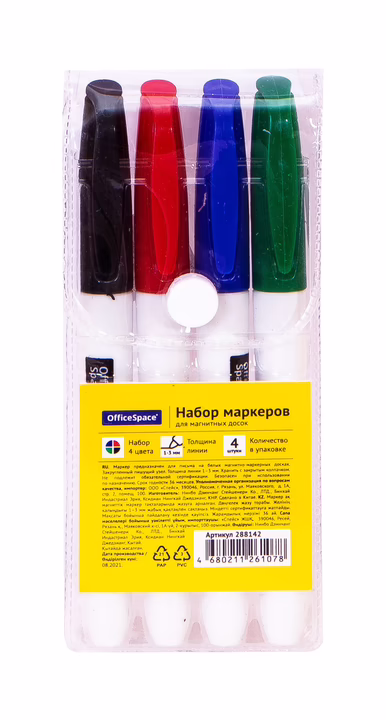 Набор маркеров OfficeSpace предназначен для письма на магнитно-маркерных досках. Чернила на водной основе легко стираются сухой губкой для досок. Хранить с закрытым колпачком.