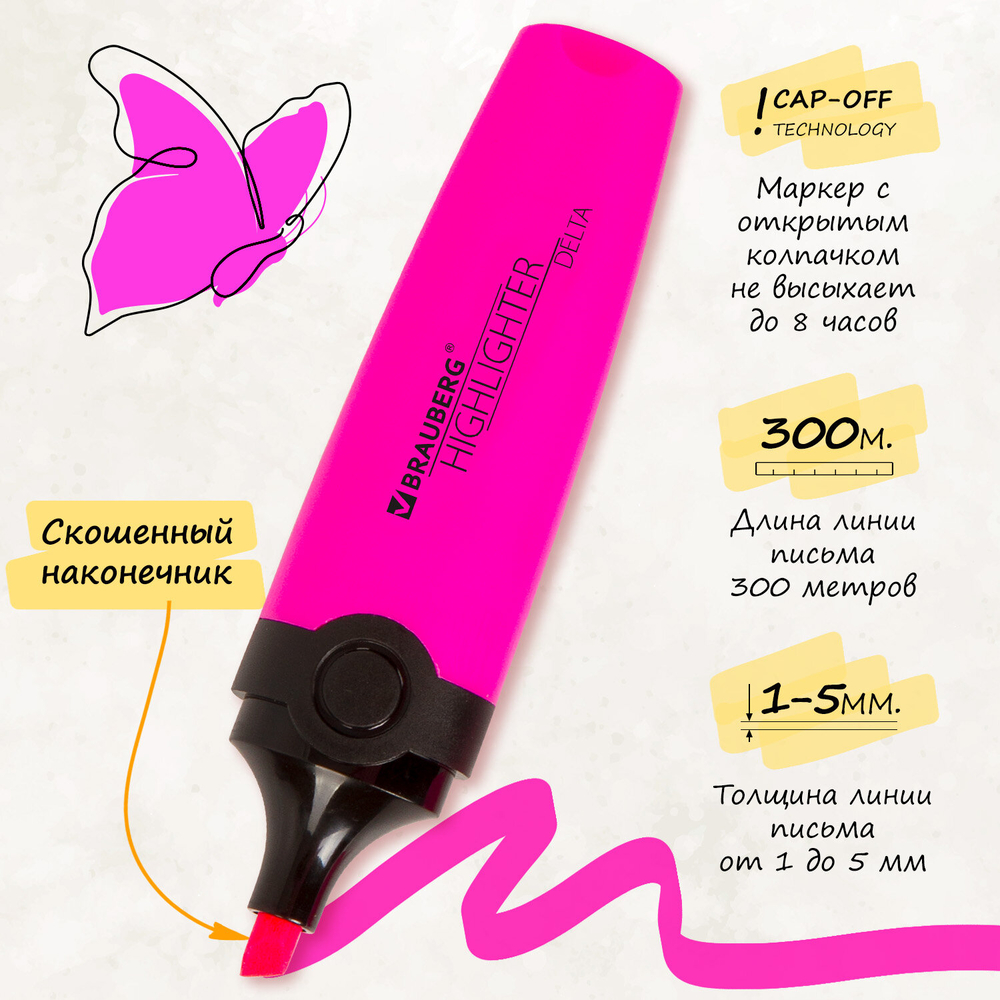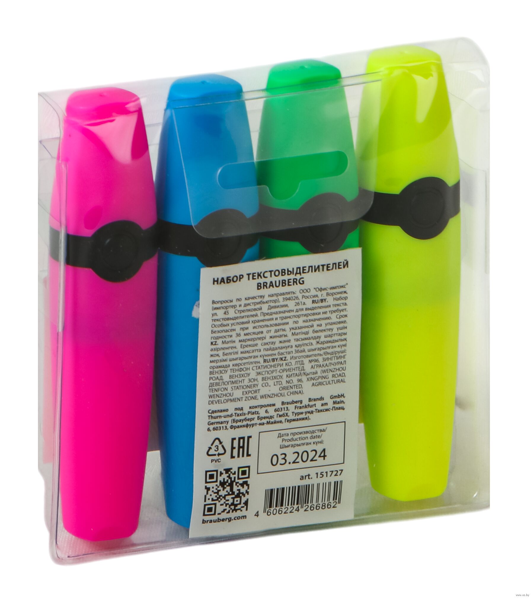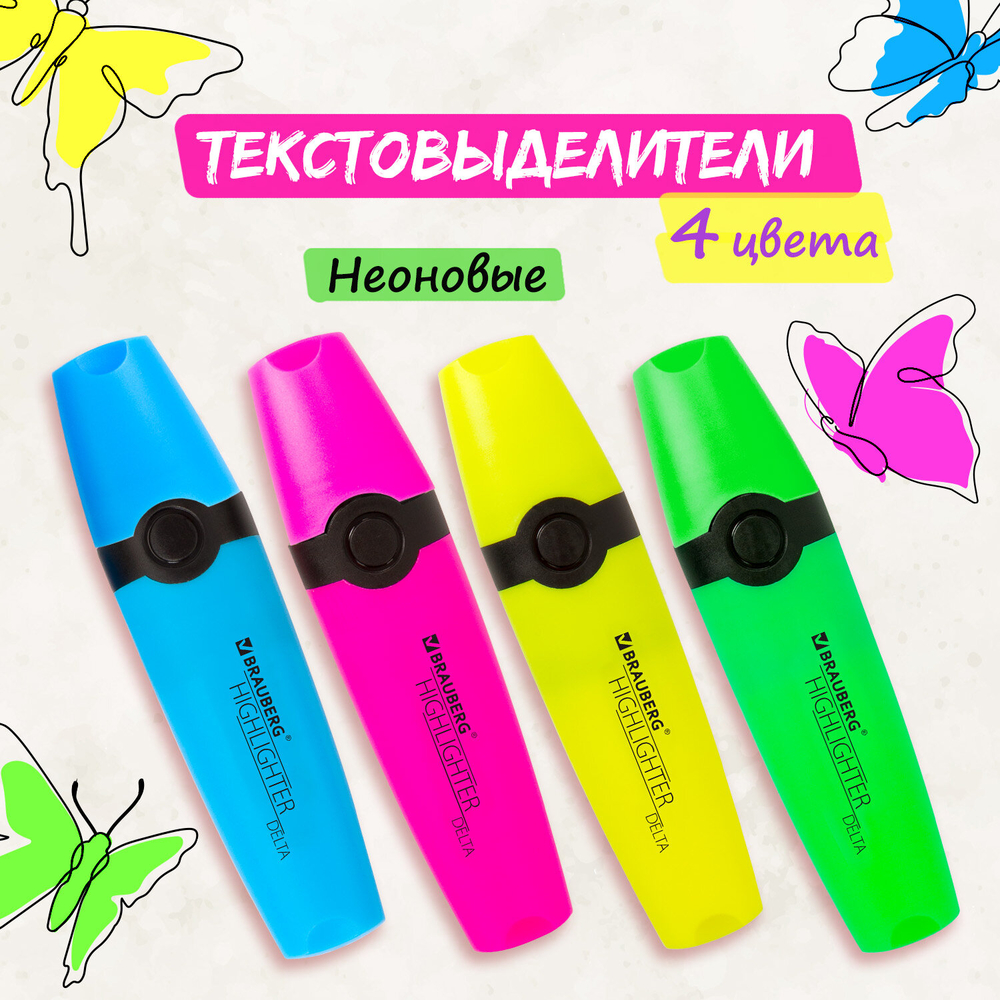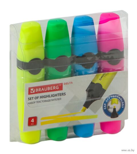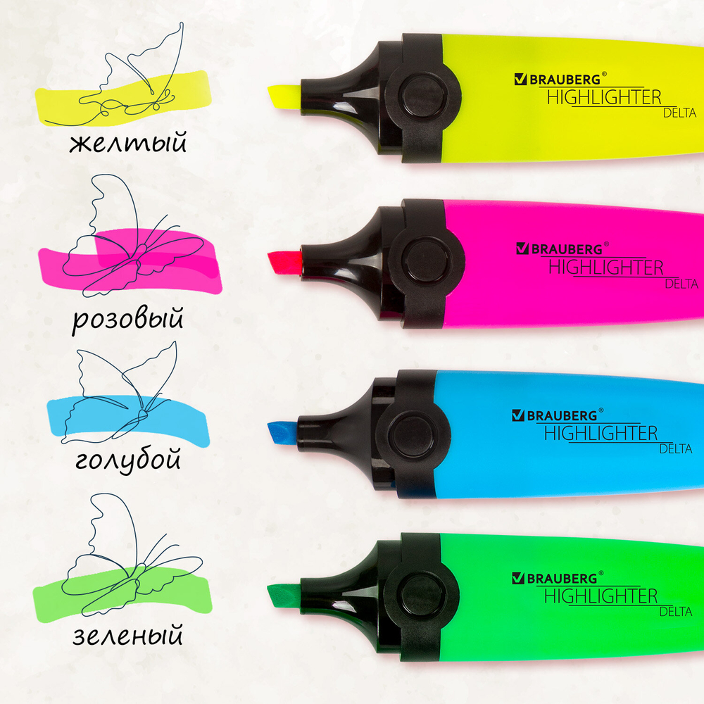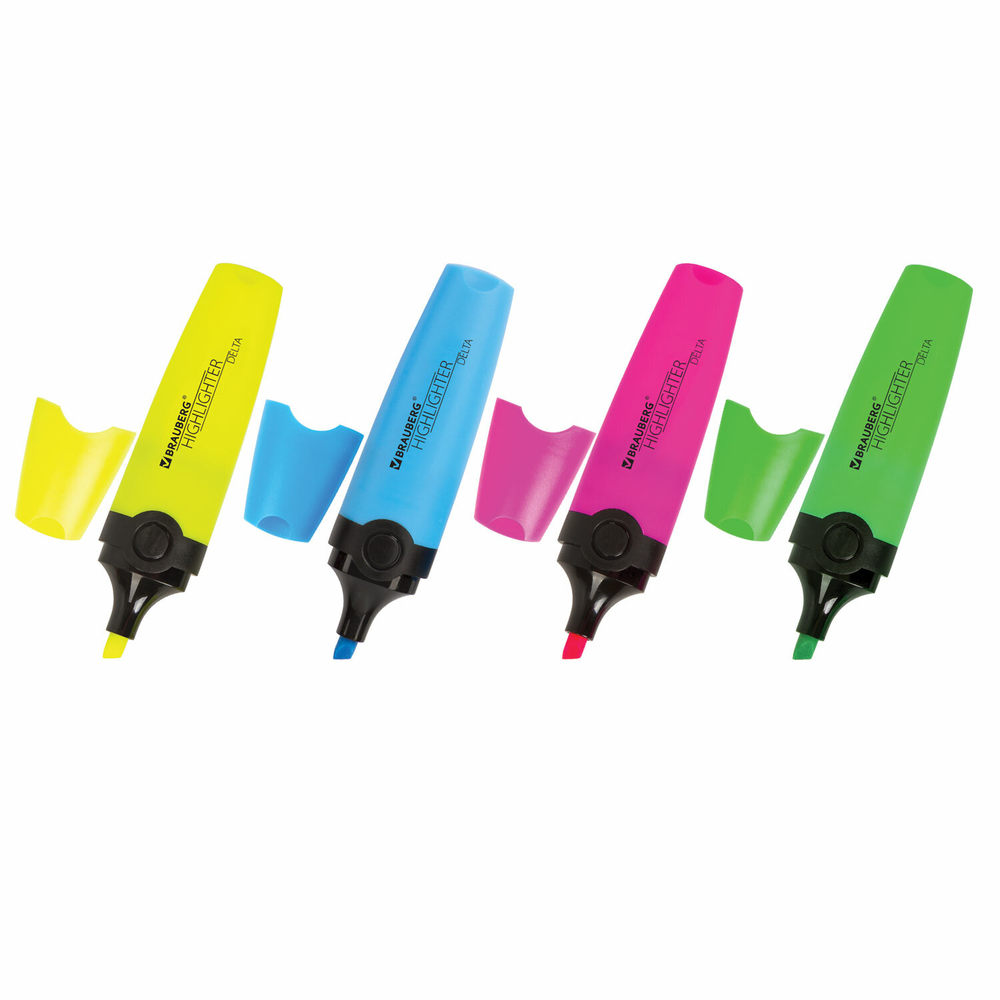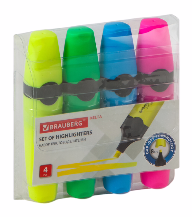 В наборе четыре неоновых цвета: желтый, зеленый, голубой, розовый. Овальная форма корпуса, диаметр которого 25 мм. Скошенный наконечник имеет толщину линии письма от 1 до 5 мм, что обеспечивает удобство при работе с текстом, напечатанным мелким шрифтом, или таблицами.