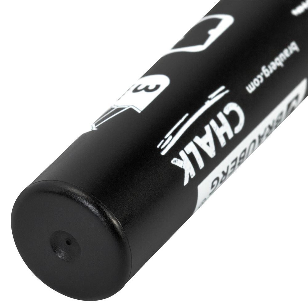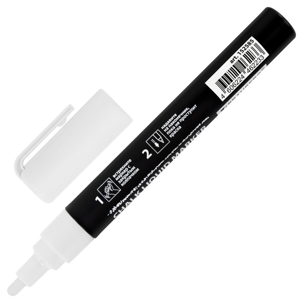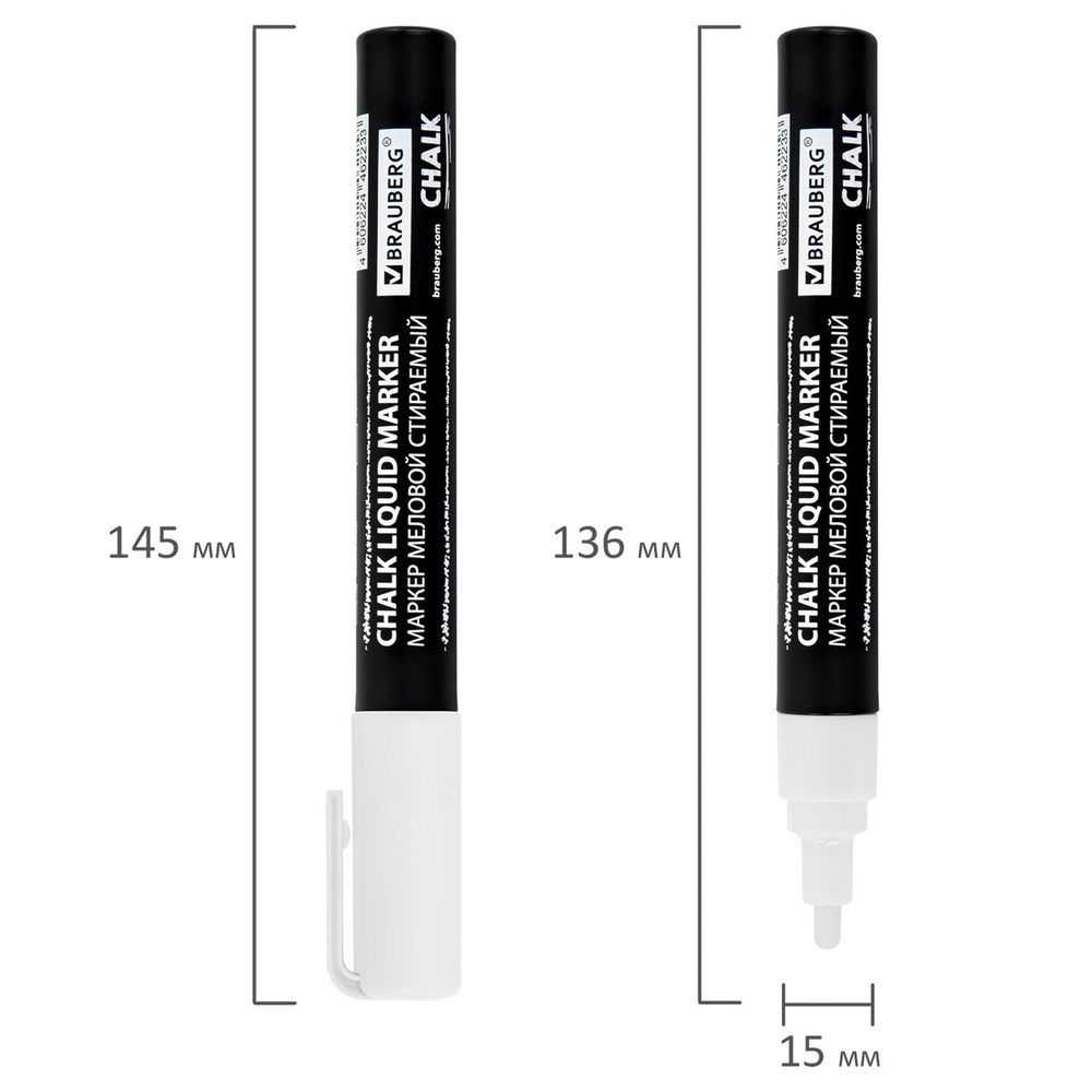 Рисунок получается плотный и яркий. Чернила на водно-меловой основе белого цвета без резкого запаха. Толщина линии письма – от 1 мм до 3 мм, зависит от угла наклона мелового маркера. Круглый корпус выполнен из пластика.