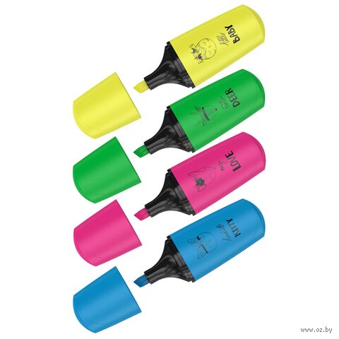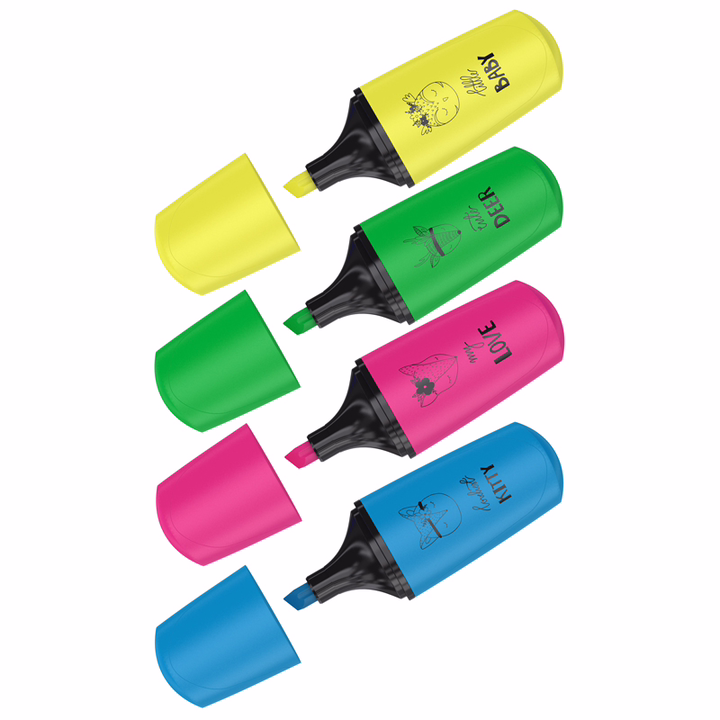 Мини-текстовыделители с флуоресцентными чернилами на водной основе. Изготовлены в компактных пластиковых корпусах без клипов с изящными рисунками на корпусе в цвет чернил.