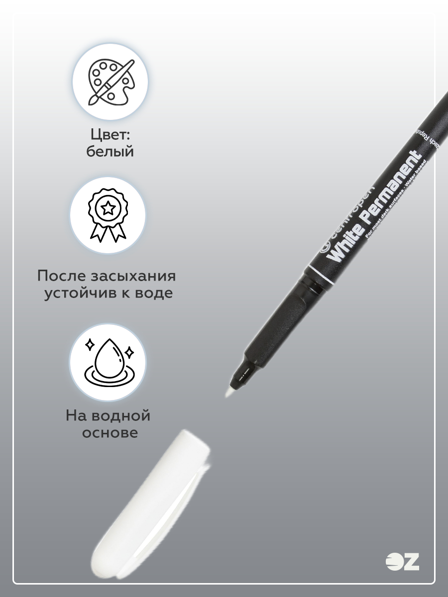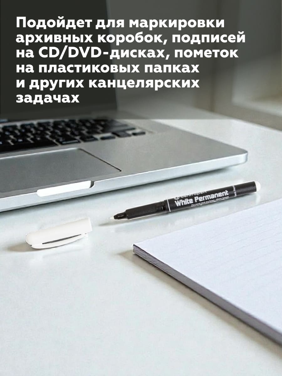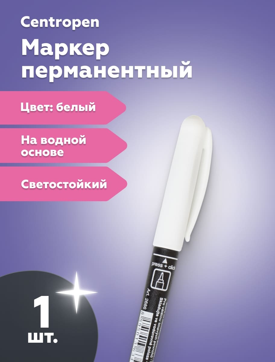 Универсальный белый маркер на водной основе. Пишет на большинстве поверхностей. После засыхания устойчив к воде, стиранию, атмосферным воздействиям. Перманентный, светостойкий.