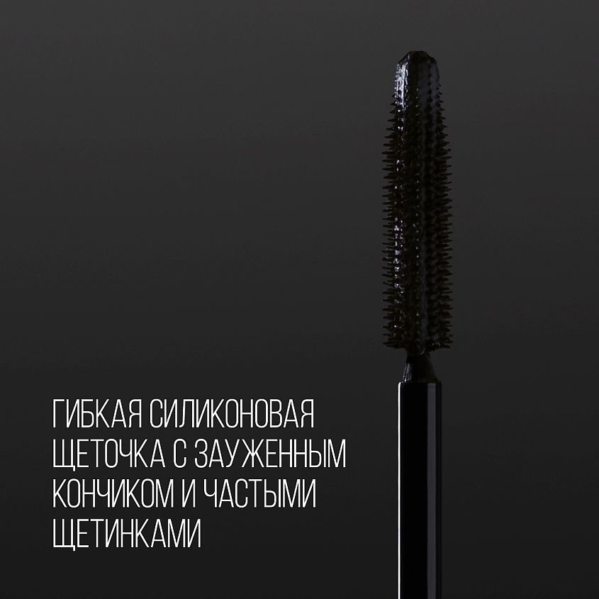 Гибкая силиконовая щеточка с зауженным кончиком и частыми щетинками набирает нужное количество массы, равномерно прокрашивает и разделяет ресницы.